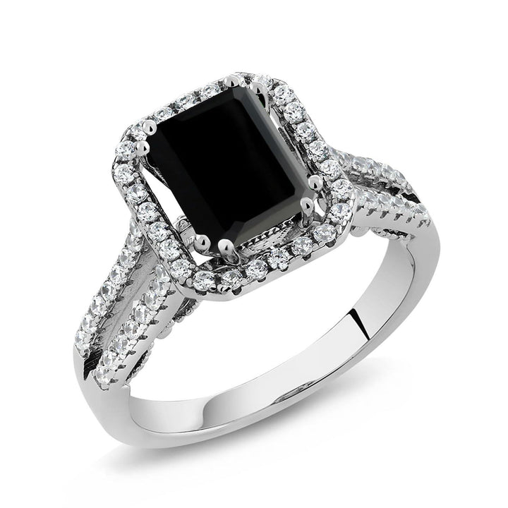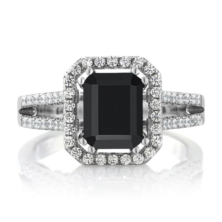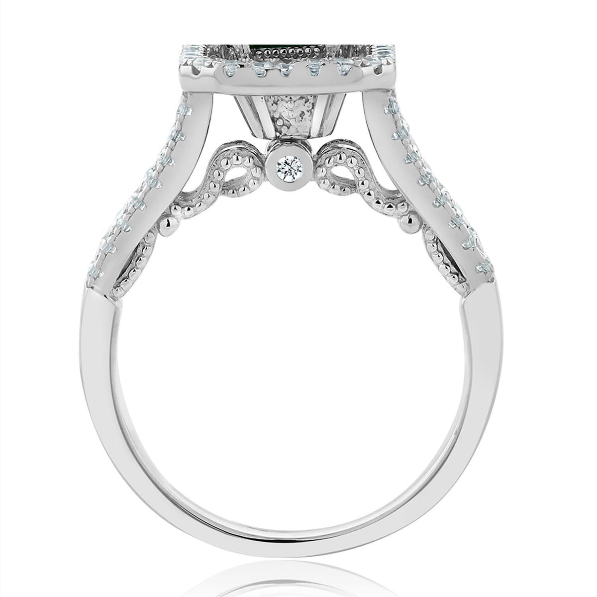 Crafted in 14K white gold featuring a 2CT emerald cut black agate center stone with moissanite accents and optional engraving. Standard engagement ring band.