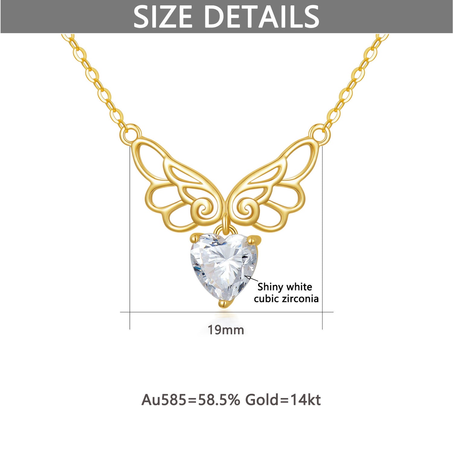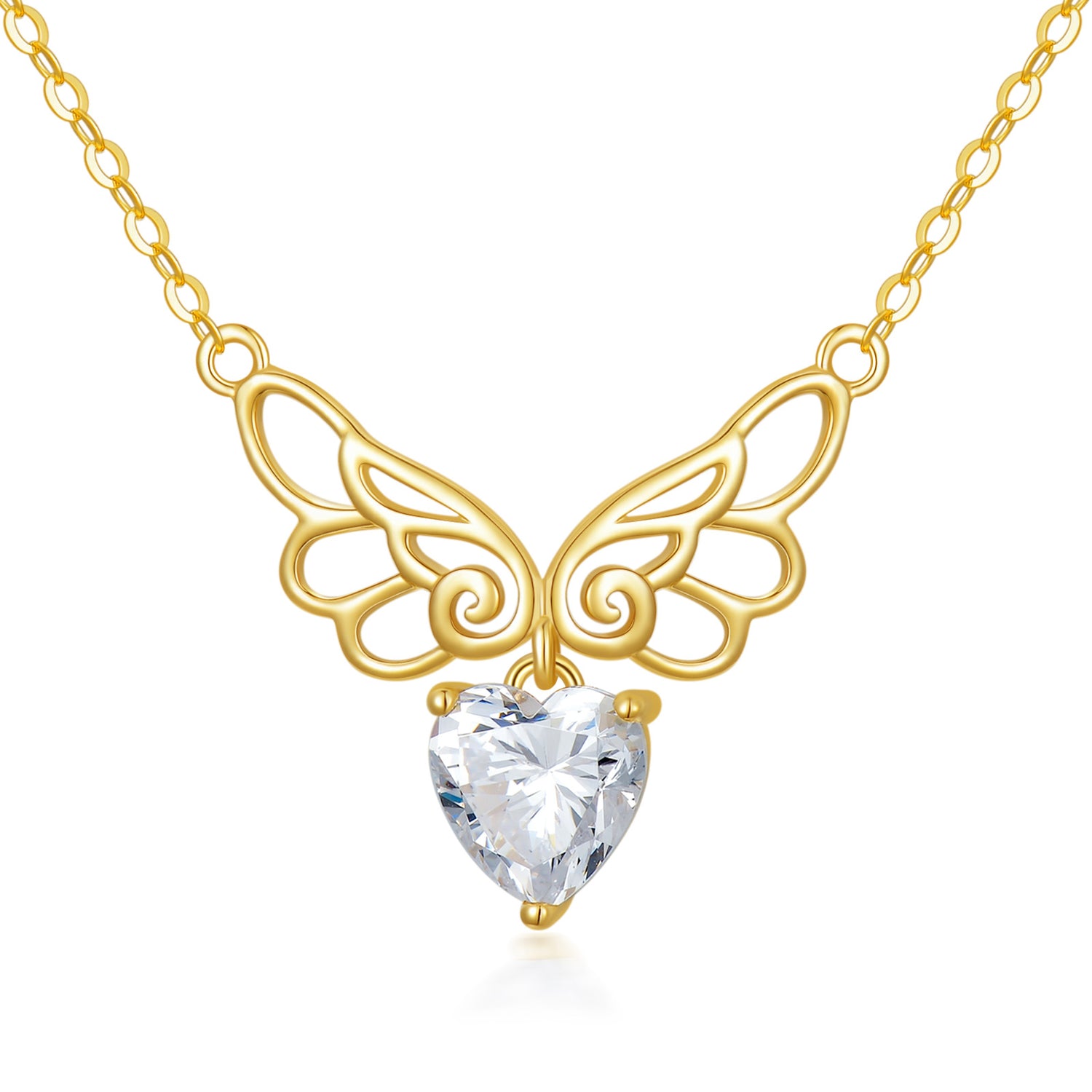 14K Gold Heart Shaped Cubic Zirconia Angel Wing Pendant Necklace