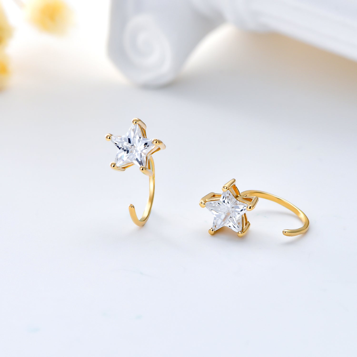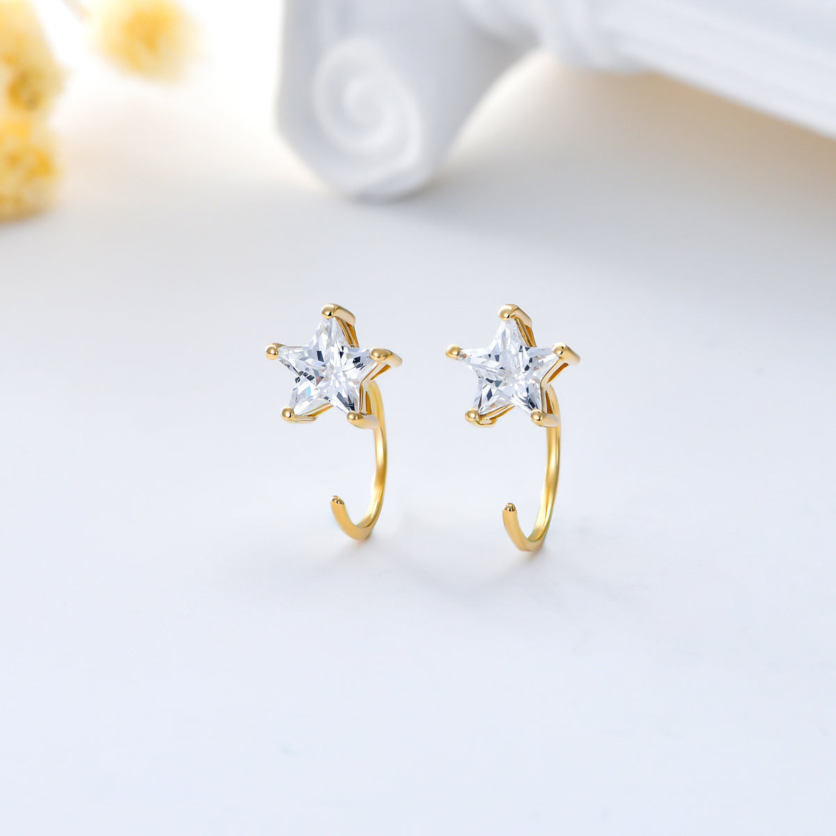 These 14K Gold Five-Pointed Star Stud Half Hoop Earrings With 5A Grade Zircon by YFN are an exquisite addition to any jewelry collection for women. Crafted from high-quality 14K Gold, these Five-Pointed Star Stud Earrings are adorned with brilliant white Cubic Zirconia stones that offer a sparkle akin to real diamonds. They are versatile enough to complement both casual and formal outfits.