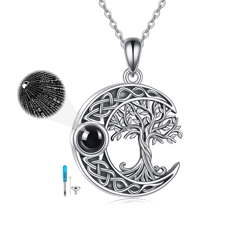 This circular urn necklace is crafted from sterling silver with a retro silver finish. It features a projection stone (displays "I Love You" in 100 languages), a Celtic Knot, Tree of Life, and moon motifs.