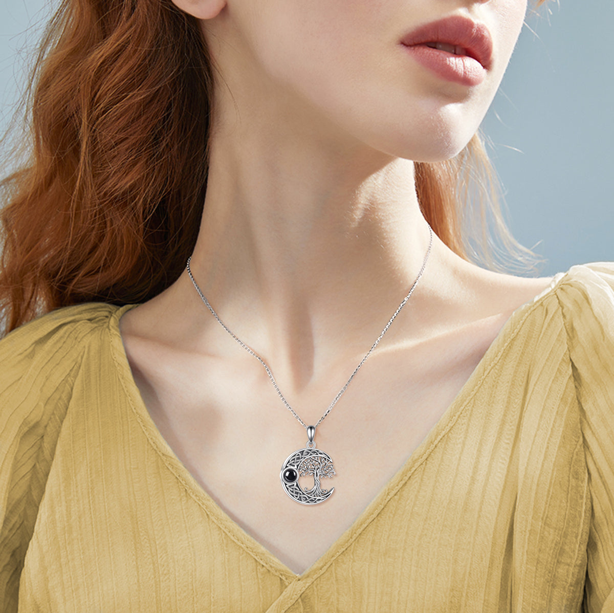This Circular Projection Stone Tree Of Life & Celtic Knot & Moon Engraved Word Urn Necklace by YFN is a deeply sentimental piece rich in spiritual and artistic detail. The circular urn, featuring the Tree of Life (interconnectedness) and the Celtic Knot (eternal love), is enhanced by a projection stone that displays "I Love You" in 100 languages. Crafted in sterling silver with a retro flair, this necklace is a profound and beautiful keepsake for women, blending timeless elegance with meaningful symbolism.