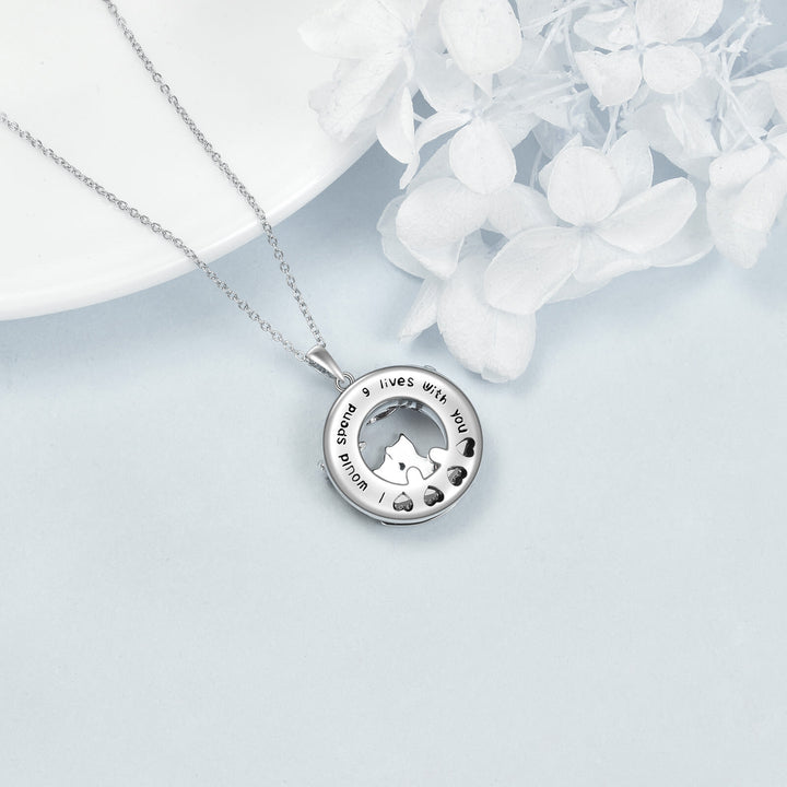 Crafted from pristine Sterling Silver with Silver and Black tones, this circular Pendant Necklace features a captivating Blue Crystal, Cat, Couple, Cloud, and Moon motifs, and the message "I Would Spend 9 Lives With You."