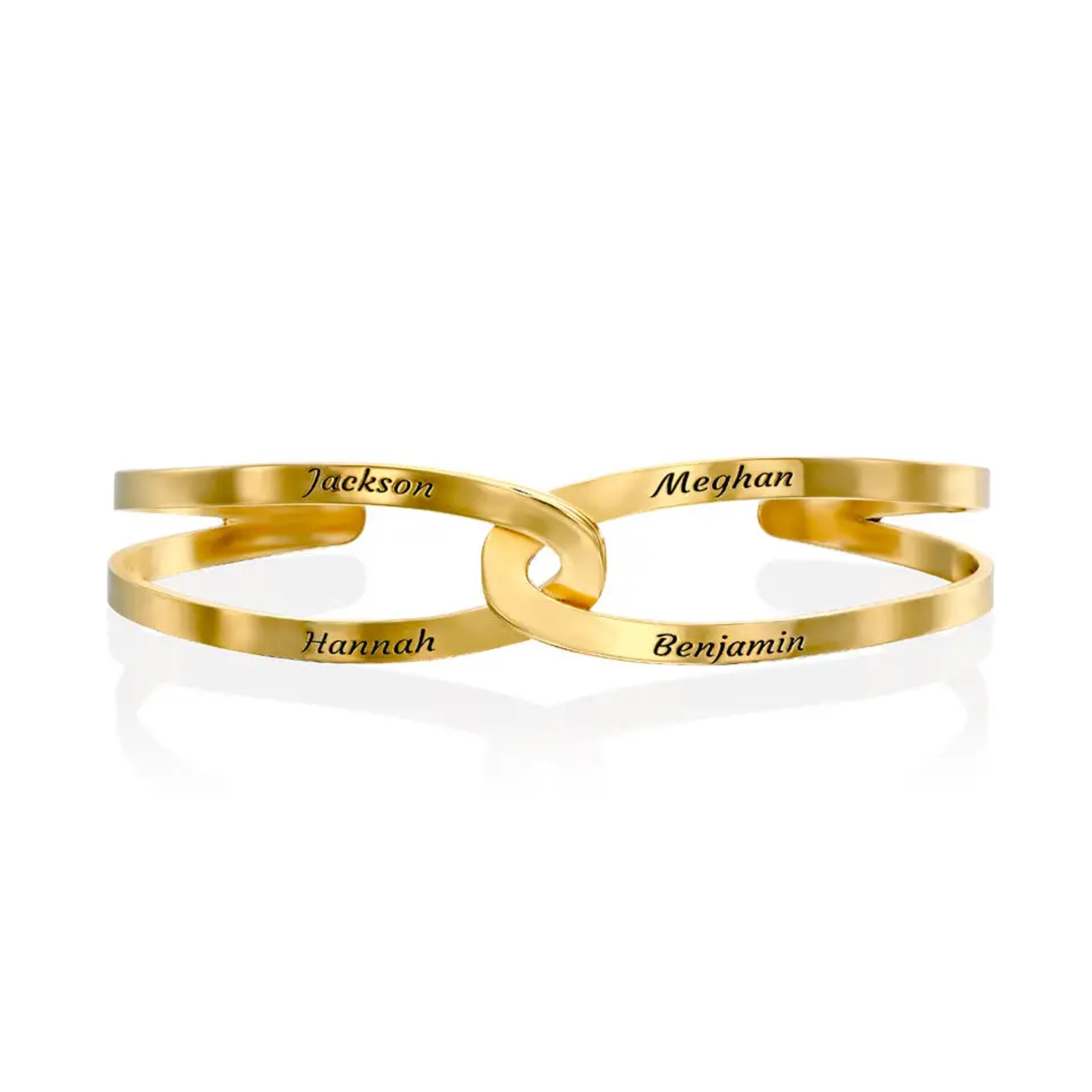 Crafted in sterling silver with yellow gold plating. Plain bangle with personalized engraved name. Unisex design. Adjustable fit depending on size.