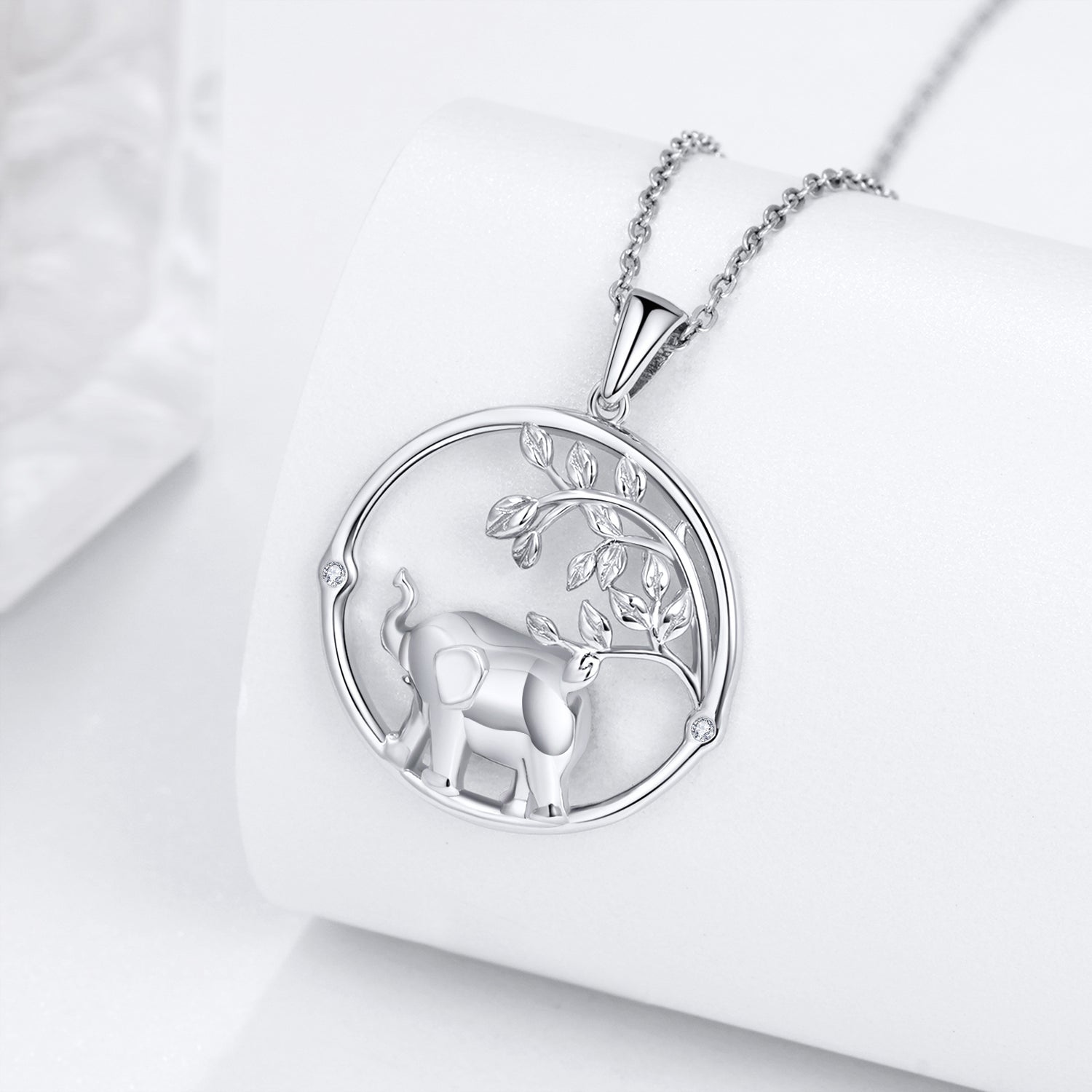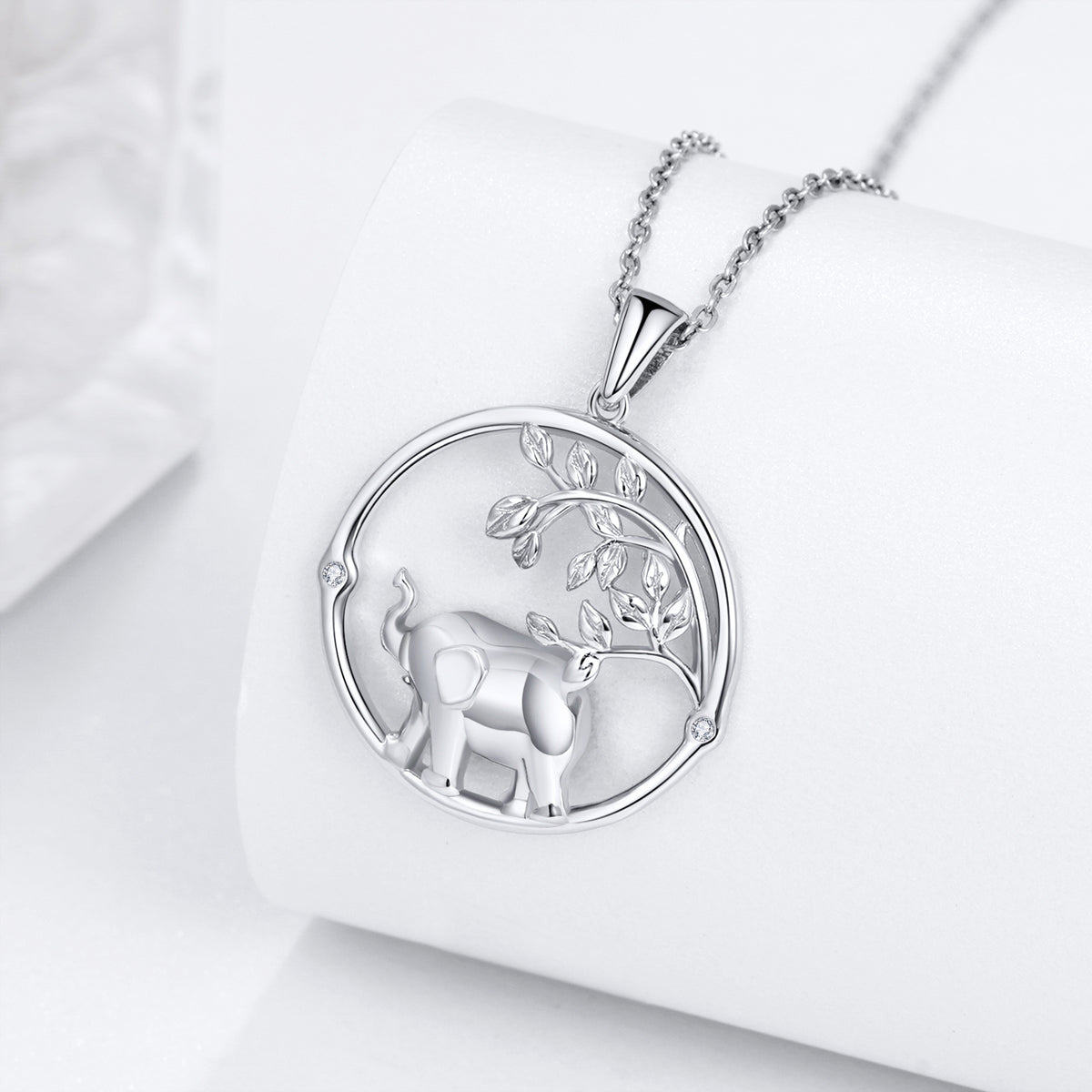 This Circular Shaped Pendant Necklace is crafted from Sterling Silver with White Gold Plating, Featuring an Elephant Motif Adorned with Dazzling Clear Cubic Zirconia.