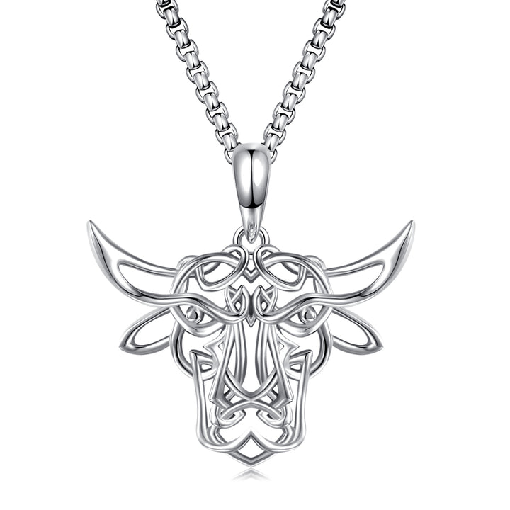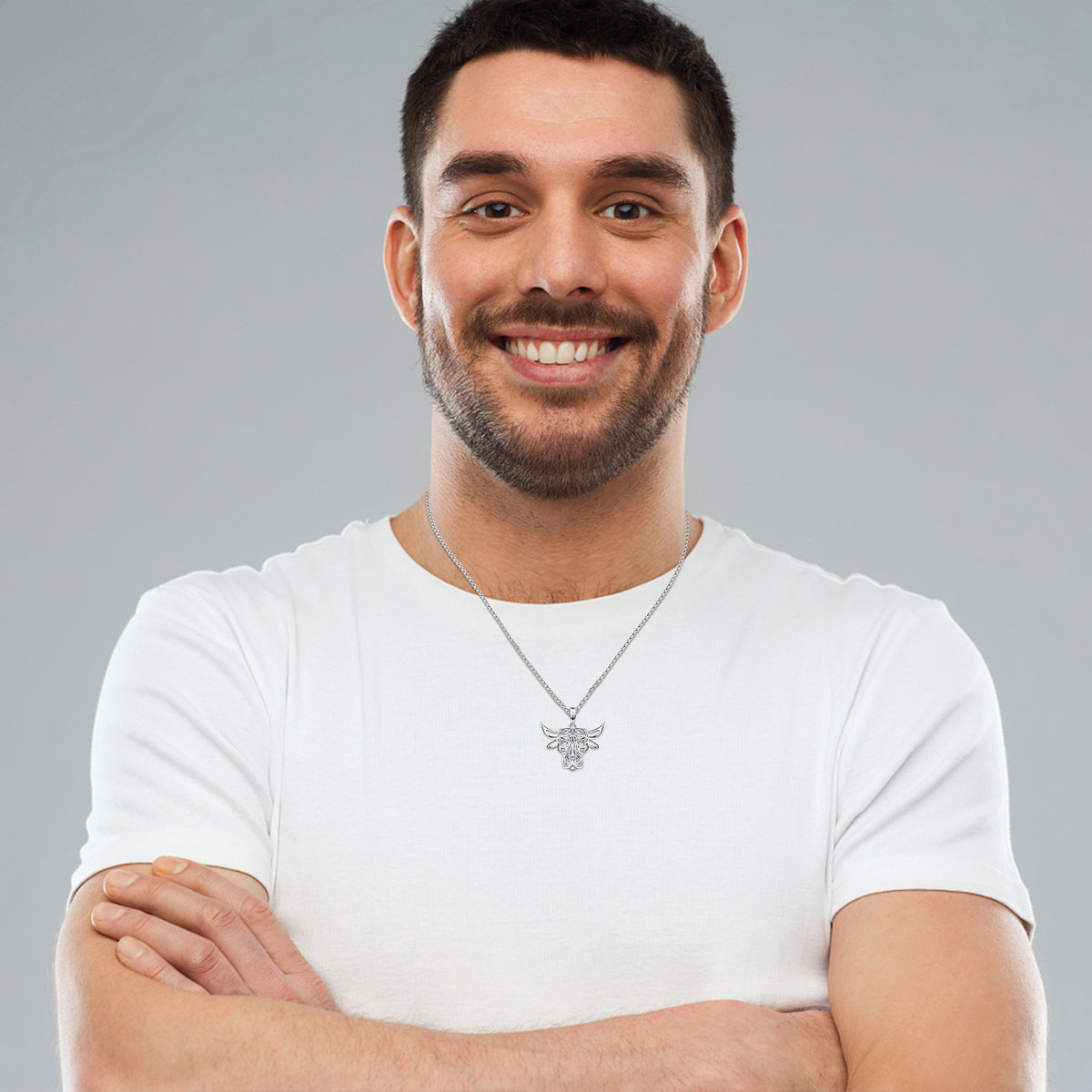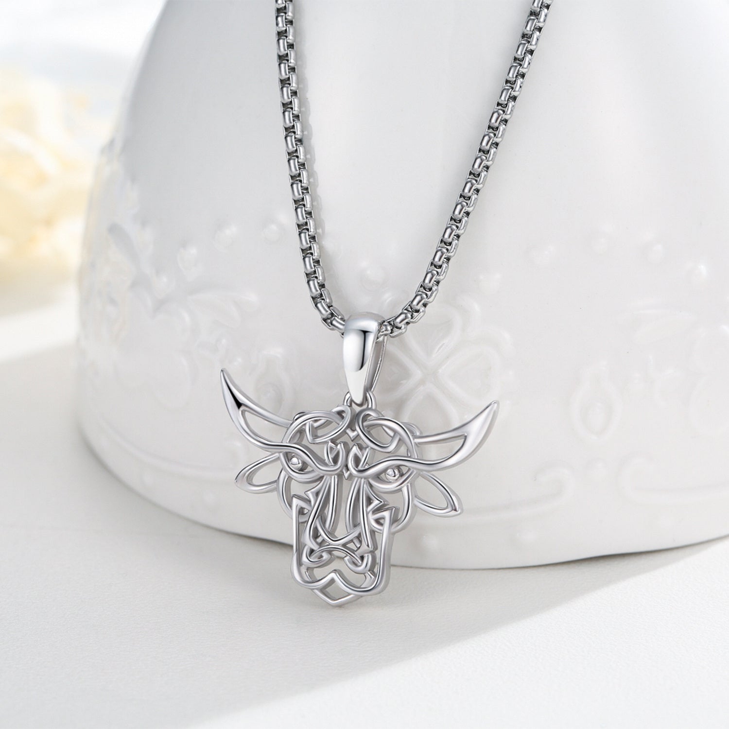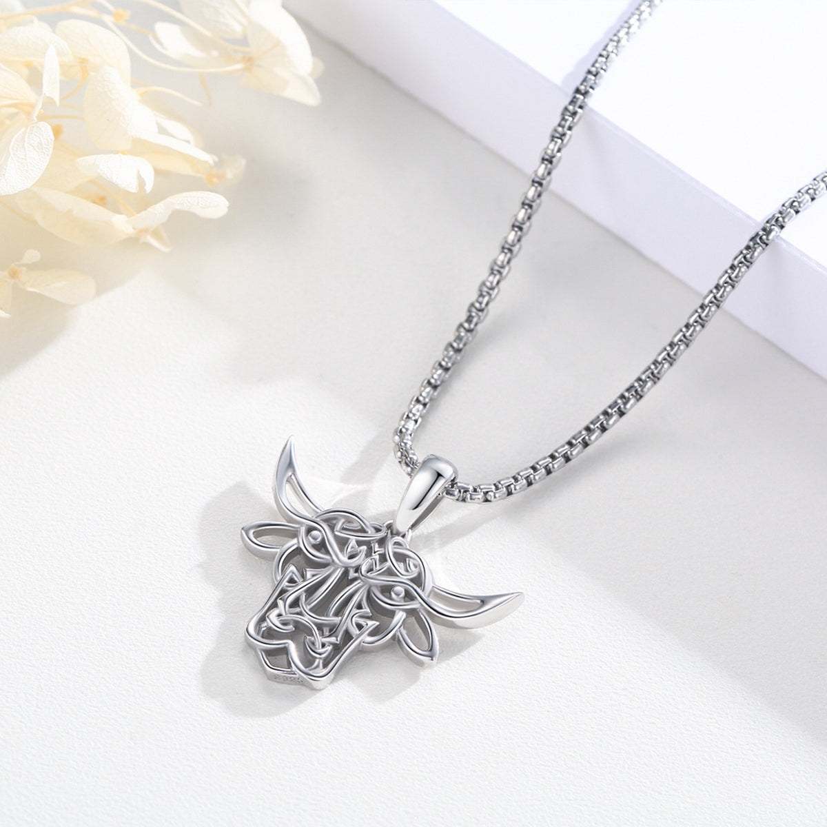 This no-stone Unisex Pendant Necklace is crafted from High-Quality Sterling Silver with a White Gold Coating, Featuring a Unique Cow Design with Celtic Knot Detailing.