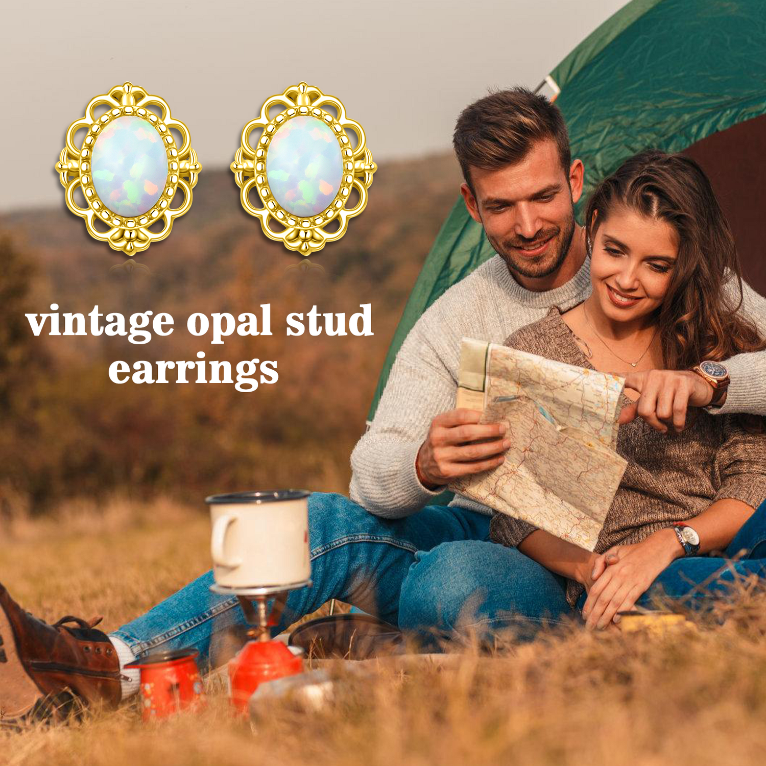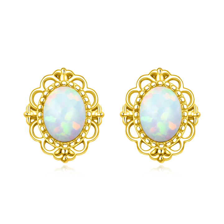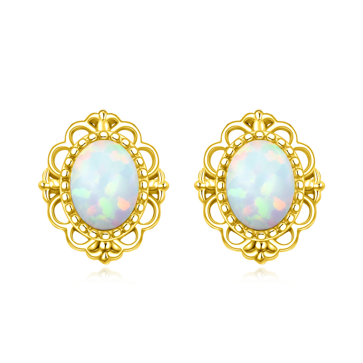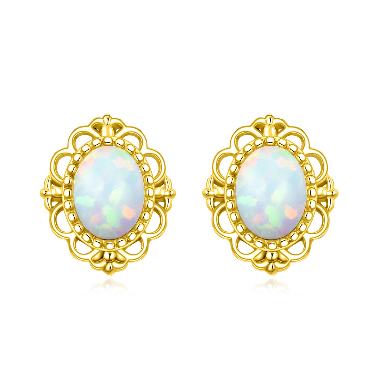 14K Yellow Gold Oval Opal Stud Earrings For Women