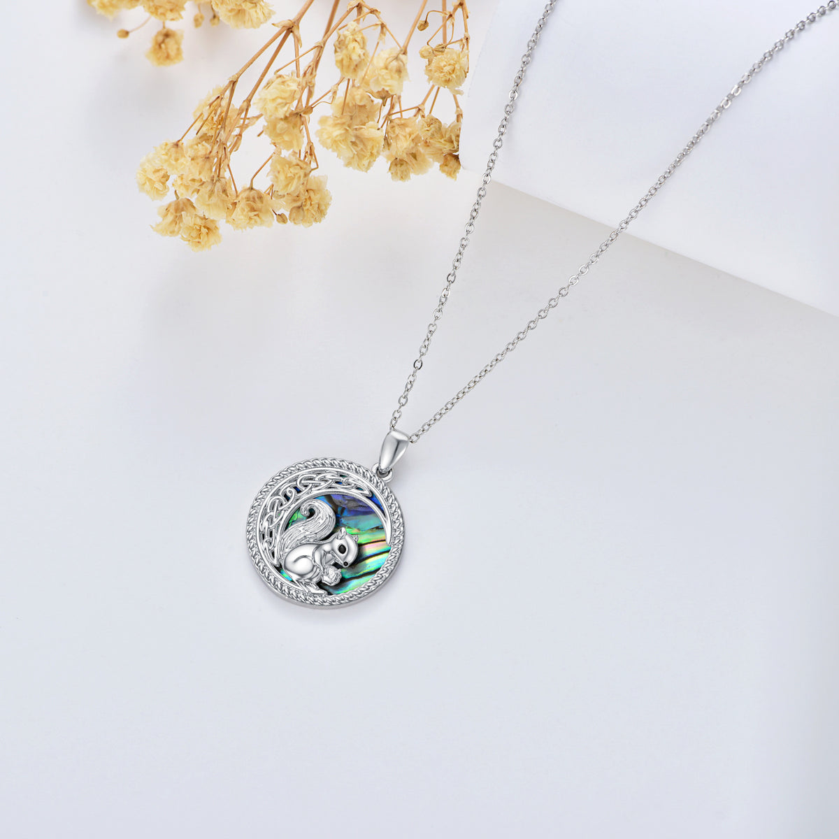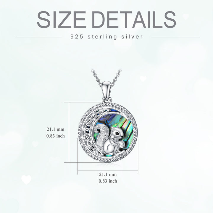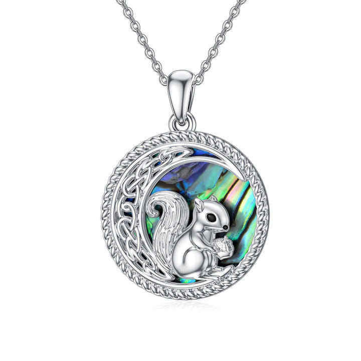 Crafted in sterling silver with white gold plating. Features abalone shell inlay, squirrel motif, Celtic knot, and moon within circular pendant.