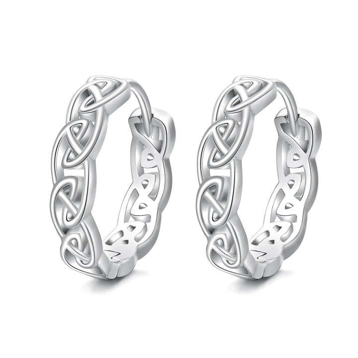 Crafted from premium Sterling Silver, these Hoop Earrings feature intricate Celtic Knot patterns and are finished with a radiant White Gold Plating (stone-free).