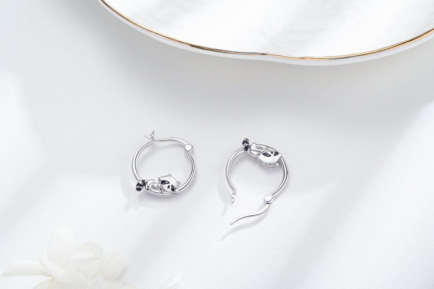 These no-stone Hoop Earrings are crafted from Sterling Silver with White Gold Plating, Featuring an Adorable Raccoon Design.