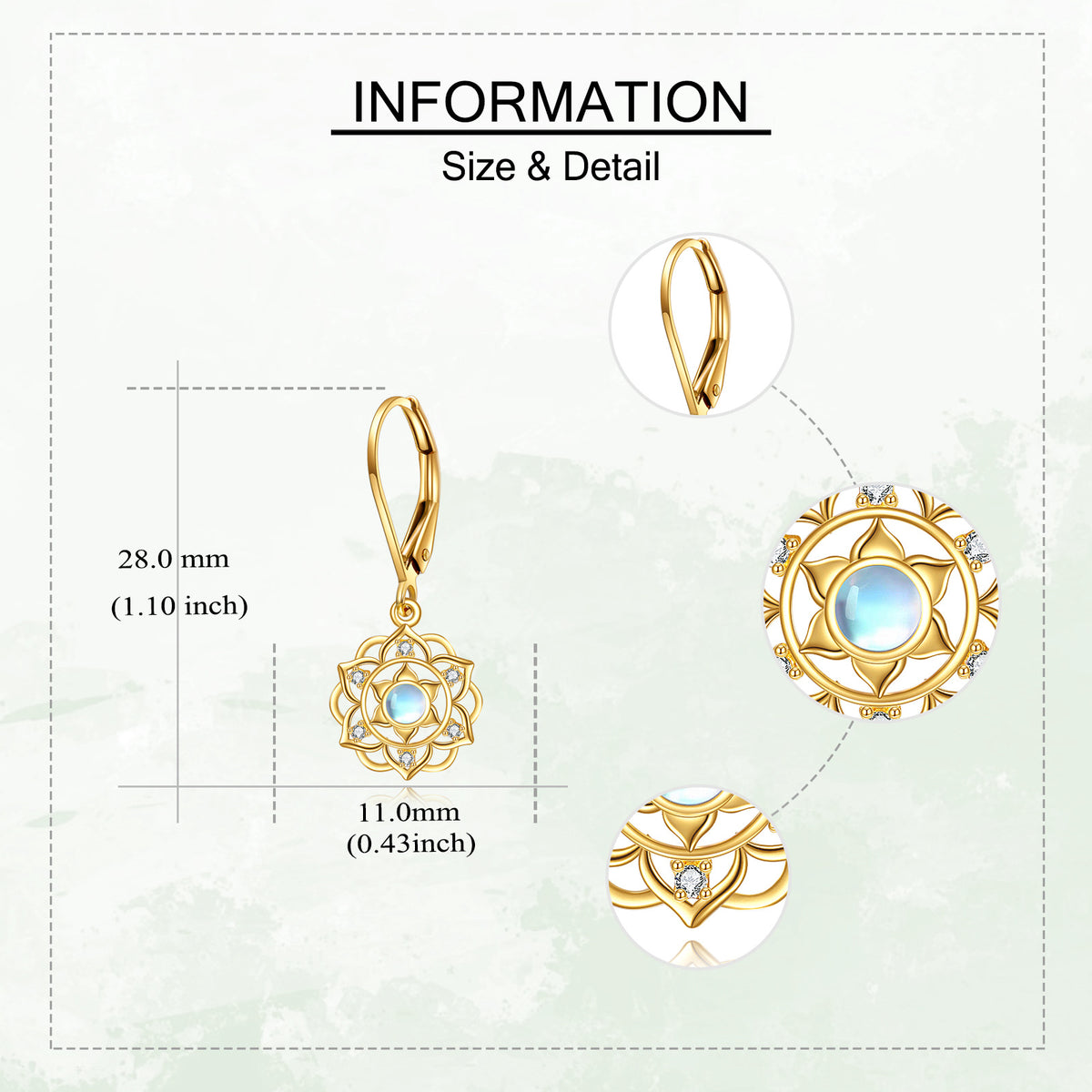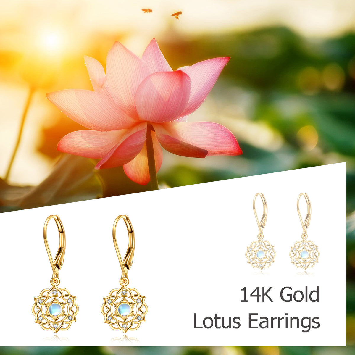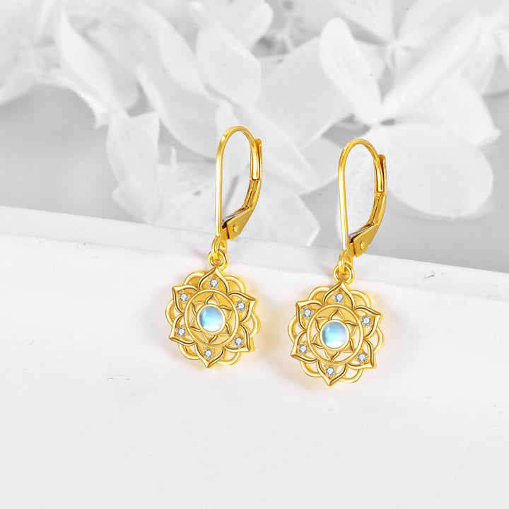 14K Yellow Gold Circular Moonstone Blue Lotus Lever-back Earrings