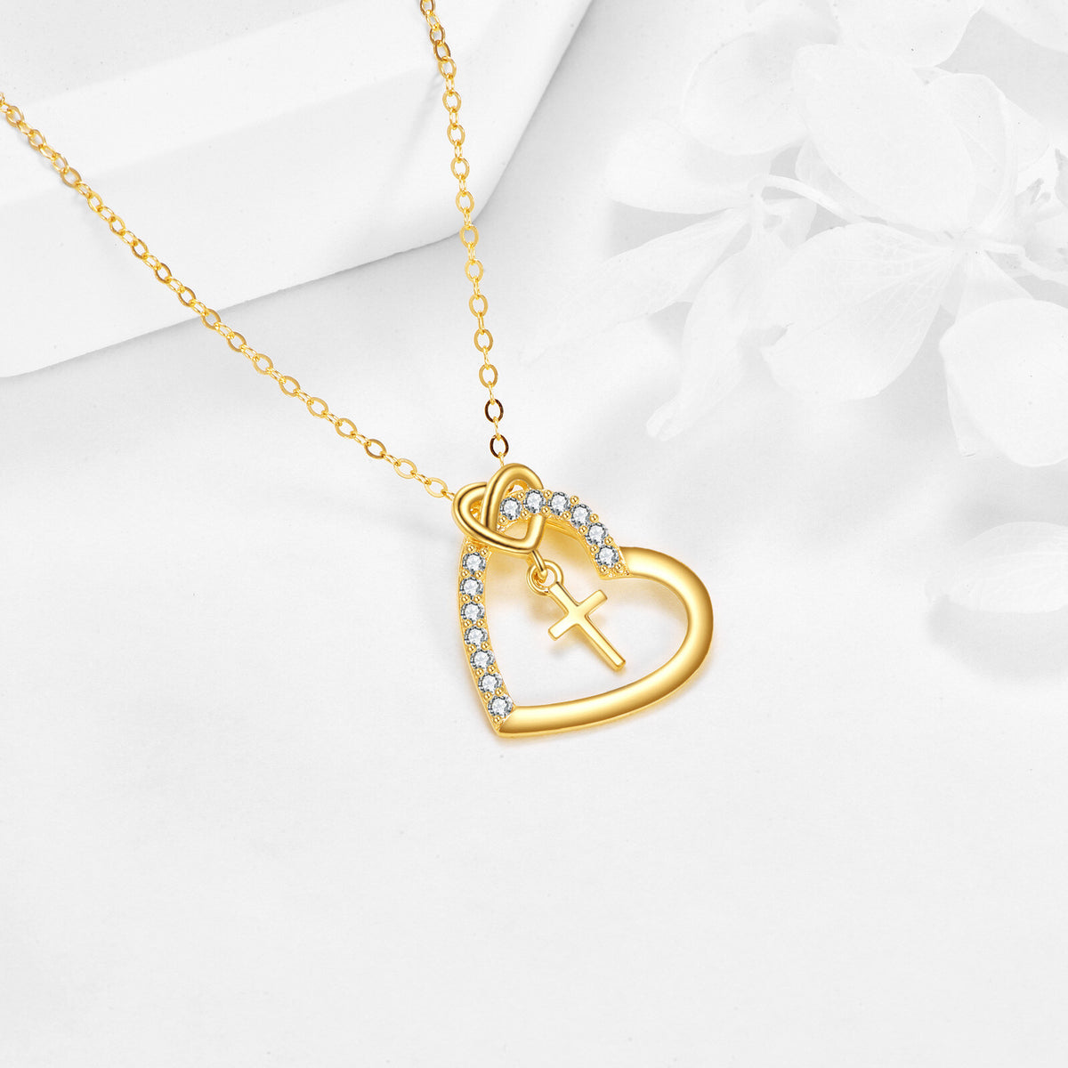 14K Gold Round Zircon Cross & Heart Pendant Necklace
