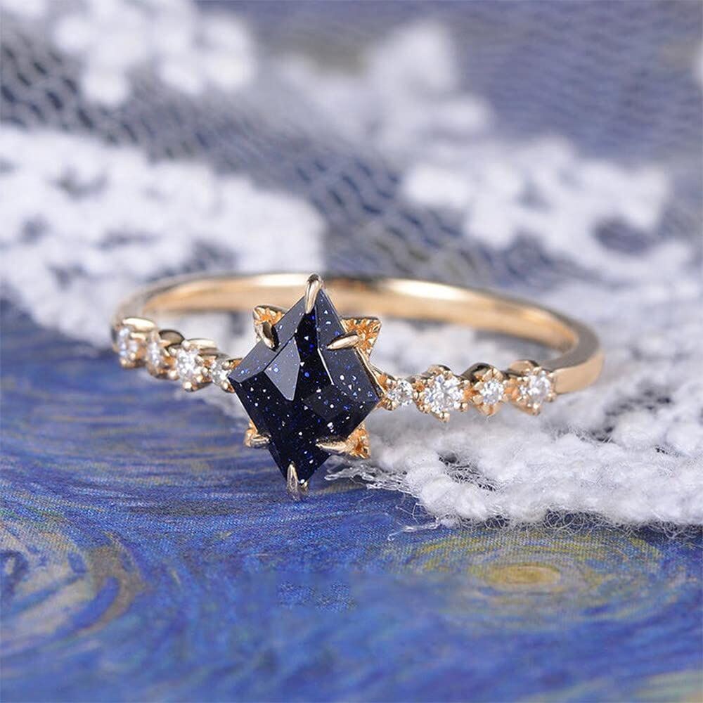 This 18K Gold 1.6CT Kite Cut Blue Sandstone Art-Deco Geometric Engagement Ring with Moissanite by YFN is a truly unforgettable piece that marries classic charm with modern artistry. Featuring a dazzling 1.6CT Kite Cut Blue Sandstone centerpiece, its deep, starry allure is captivating. Set in luxurious 18K Gold, the design is brilliantly enhanced by radiant Moissanite accents masterfully arranged in a sophisticated Art-Deco geometric design, ensuring this ring stands out as a unique and luxurious symbol of an enduring love story.