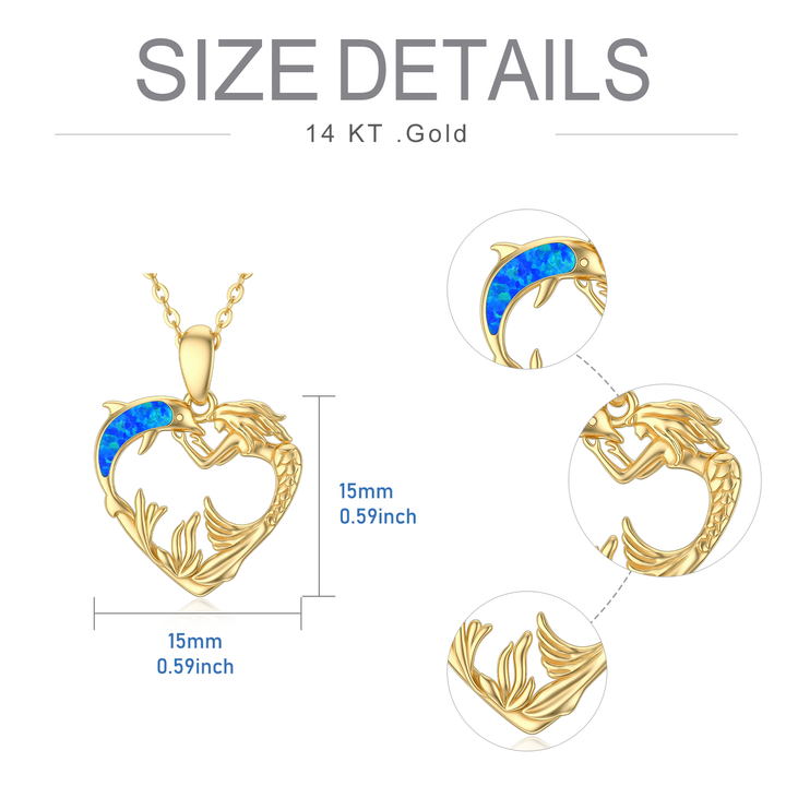 14K Yellow Gold Opal Dolphin With Mermaid Heart Pendant Necklace For Women