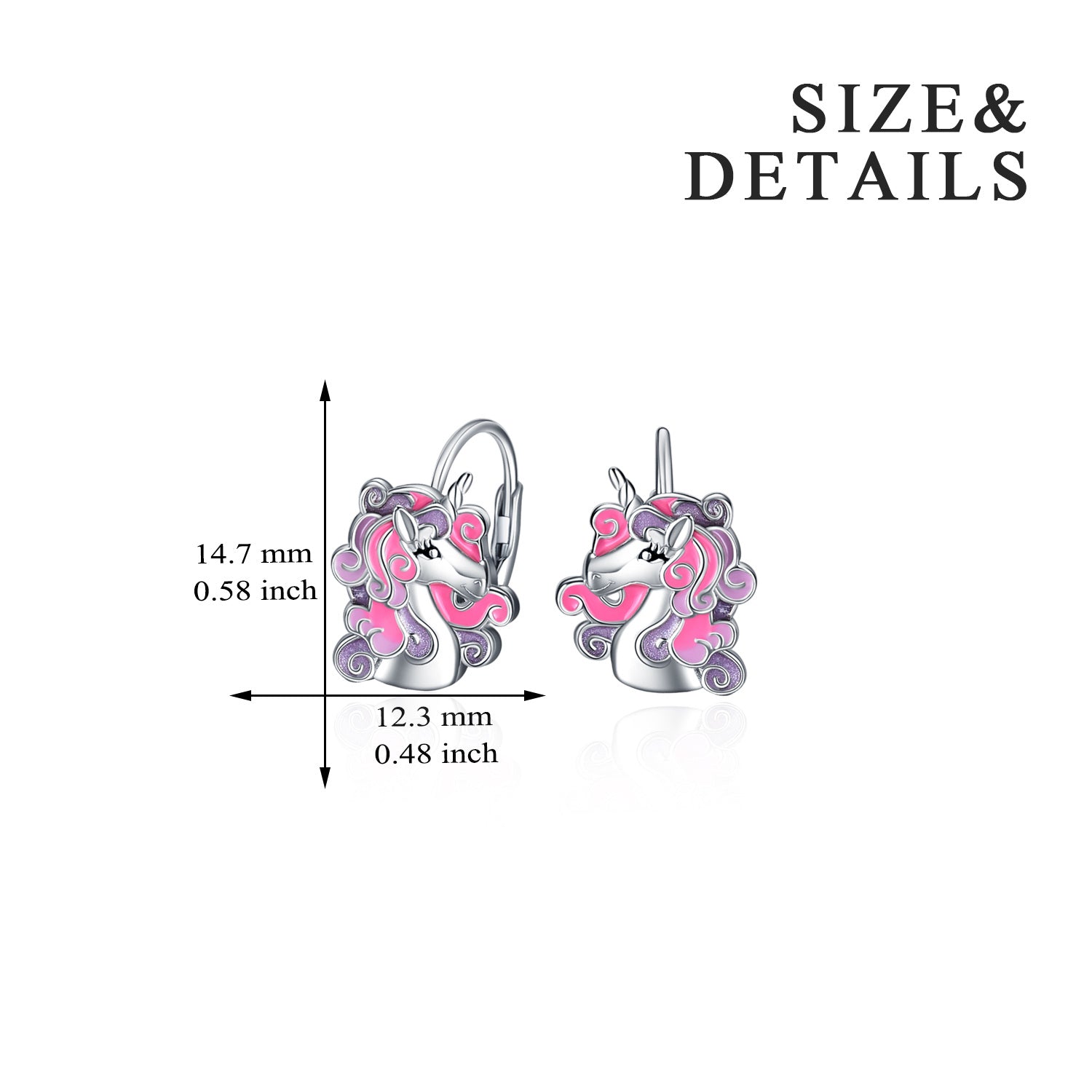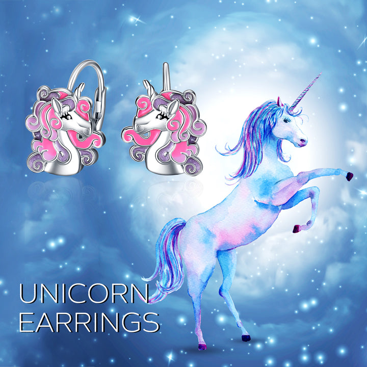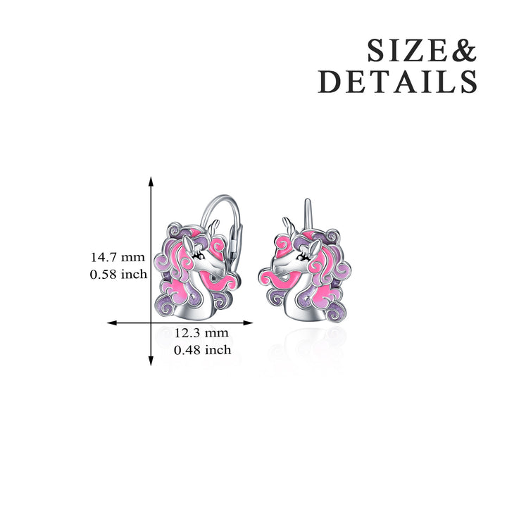 Crafted from durable Sterling Silver with White Gold Plating, these no-stone Lever-back Earrings feature an enchanting Unicorn Motif.
