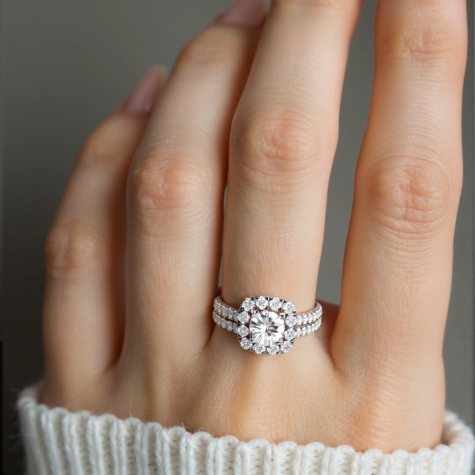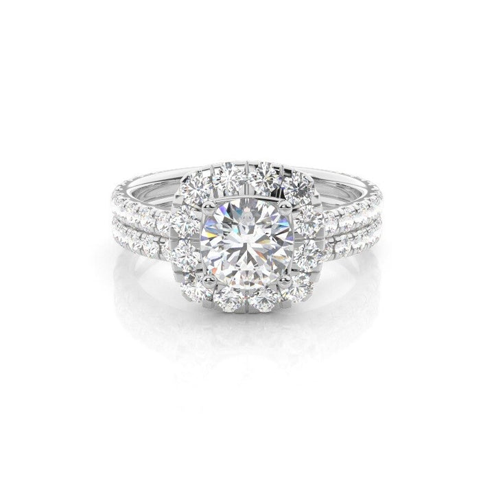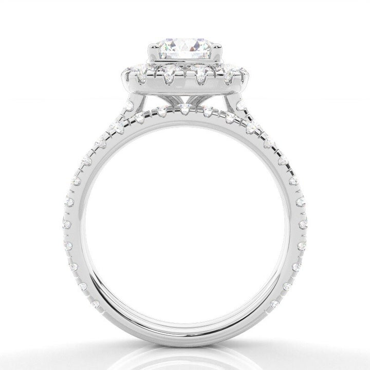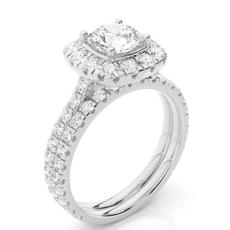 This bridal set/wedding ring is crafted from 14K solid white gold. It features a round lab-created diamond (D color, VVS1-VS1 clarity) with a total weight of 1 to 3.5 CT. T.W. (center stone 0.5 to 3 CT). It is IGI Certified (3EX polish/cut/symmetry).