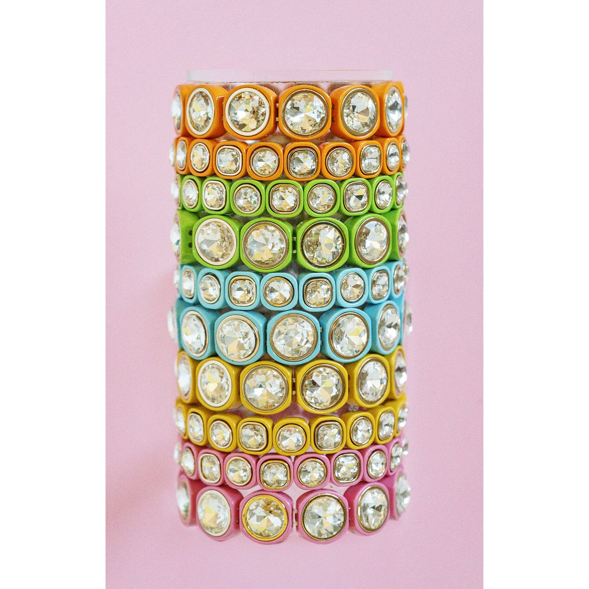 This City Girl Round Bracelet - Lemonade by Smith & Co. Jewel Design is a fun and bold accessory. With its large, round acrylic rhinestones and gold details, this stretch bracelet adds the perfect amount of glitz to your look. Its easy-to-wear, one-size-fits-all style makes it a versatile piece for stacking or wearing alone. The lemonade color gives it a playful and vibrant aesthetic, symbolizing a little bit of character and imperfection in the most perfect way.