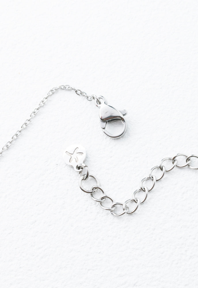 This necklace is made from hypoallergenic, lead- and cadmium-free stainless steel. It has an adjustable size of 16-18 inches.