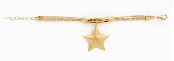 This Star Charm Bracelet by Saachi is a fun and playful accessory. The golden lobster claw bracelet is adorned with star charms, adding a touch of whimsical style to your wrist. It's a great choice for adding a little sparkle and charm to your look.