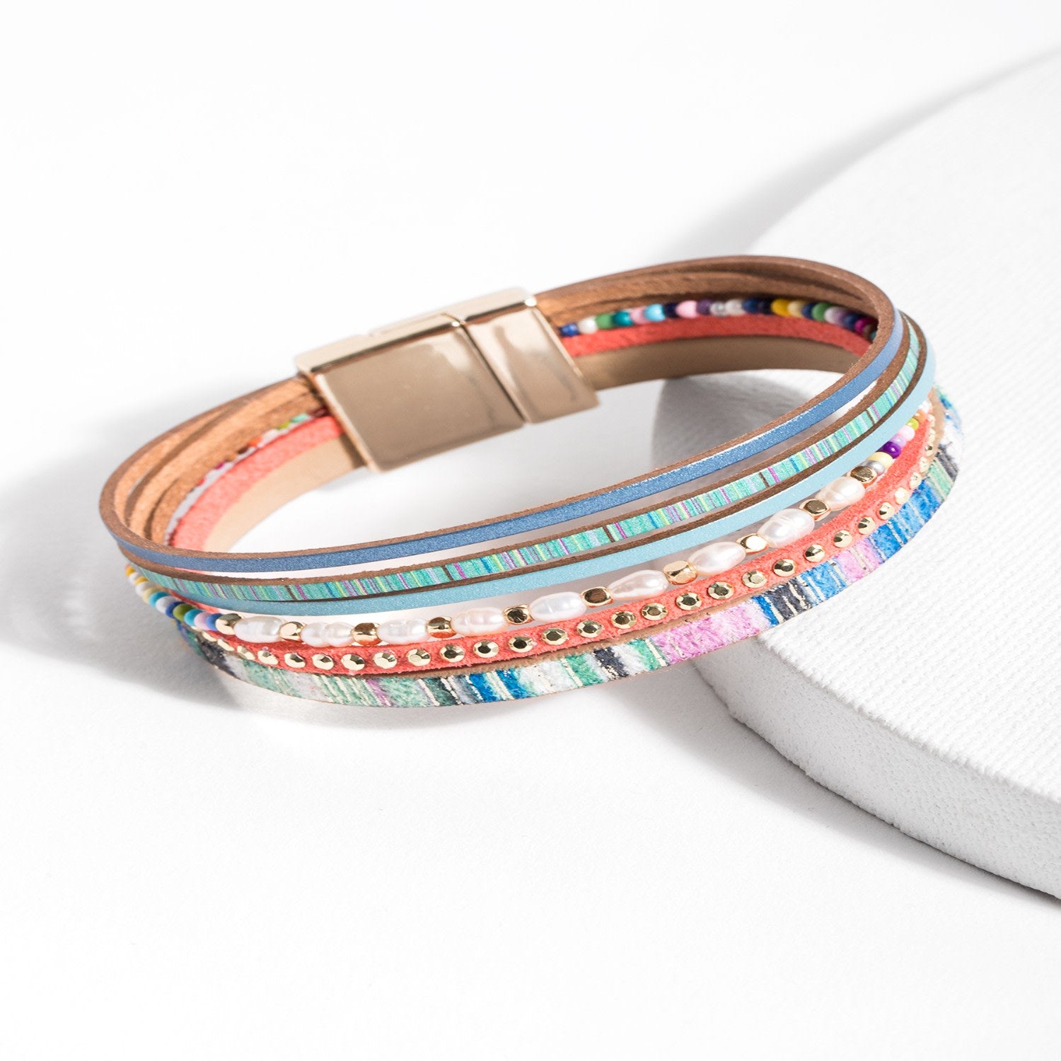 This bracelet is made from a blend of materials, including PU leather, glass, alloy, iron, freshwater pearls, and suede. It measures 7.7 inches by 0.8 inches and has a magnetic clasp.