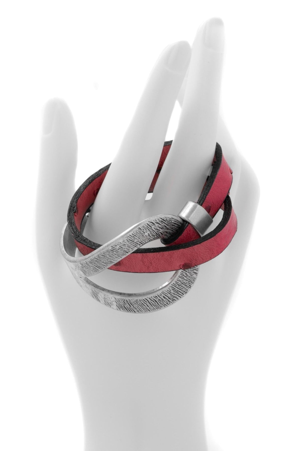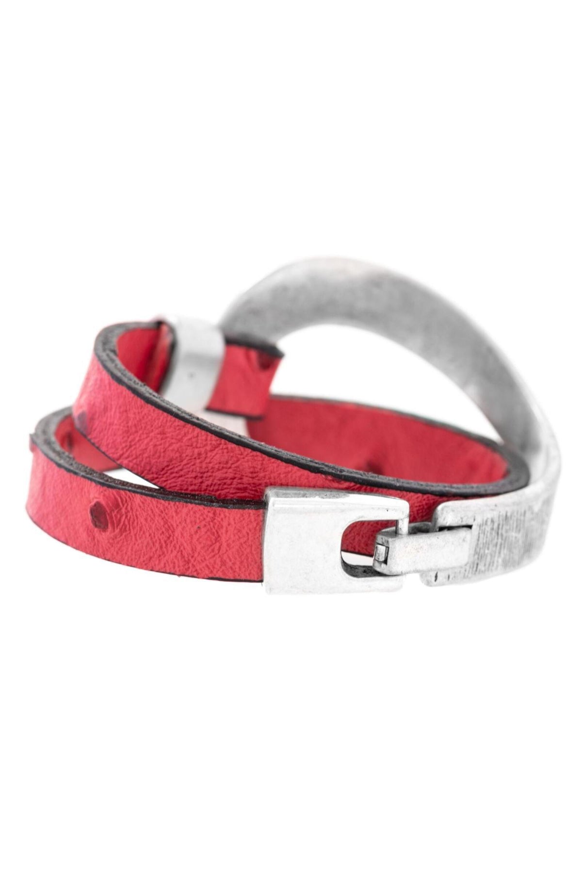 This Hammered Double Wrap Leather Loop Red Bracelet by Saachi is a bold statement piece perfect for a night out. The thick, genuine leather strand wraps comfortably around your wrist, while a hammered metal loop adds a touch of artistic texture. Its rich red color and unique design create a confident, eye-catching look. The easy-to-use fold-over clasp ensures it stays securely on your wrist, making it a powerful and stylish accessory.