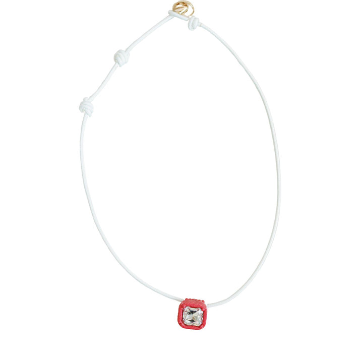 This choker necklace is crafted with an adjustable leather cord, a square acrylic jewel center, and an enamel setting. It is designed to be a "candy collar."