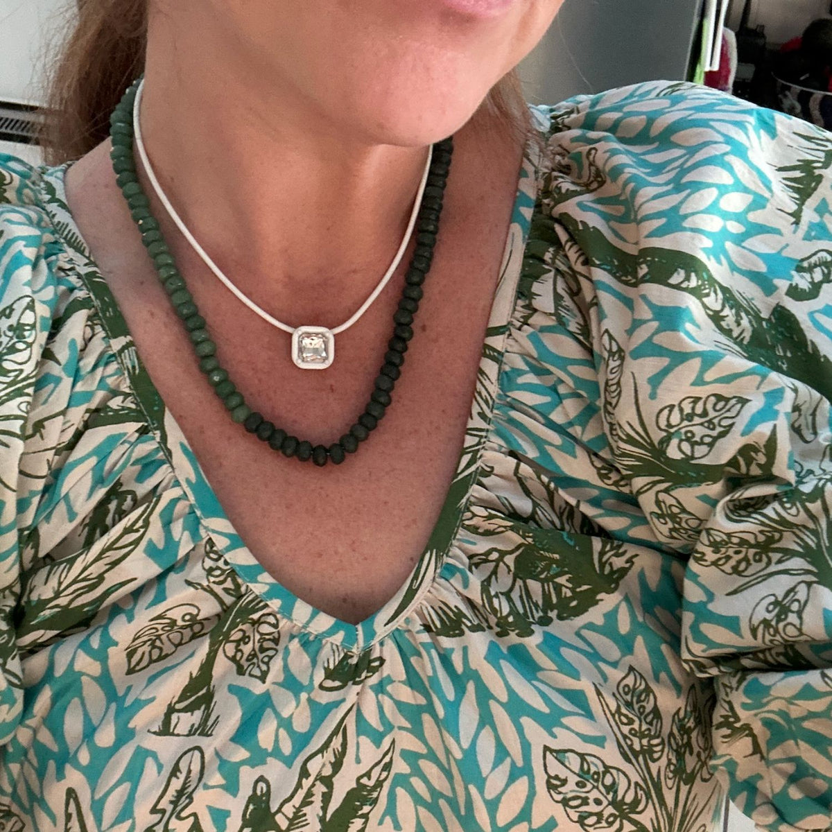 This choker necklace is crafted with an adjustable leather cord, a square acrylic jewel center, and an enamel setting. It is designed to be a "candy collar."