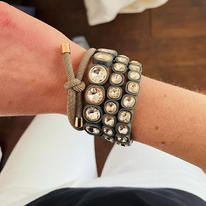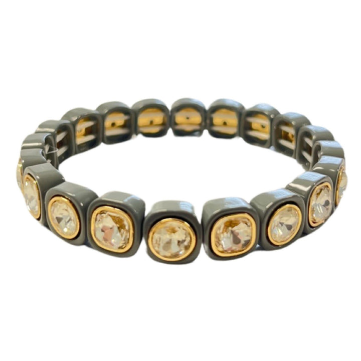The City Girl Petite Bracelet - Grey by Smith & Co. Jewel Design is a fun and bold accessory. This stretch bracelet is easy to take on and off and is one-size-fits-all. It has an enamel base with acrylic rhinestones and gold detail. It is handmade and water-resistant. The design is perfect for stacking with other bracelets.
