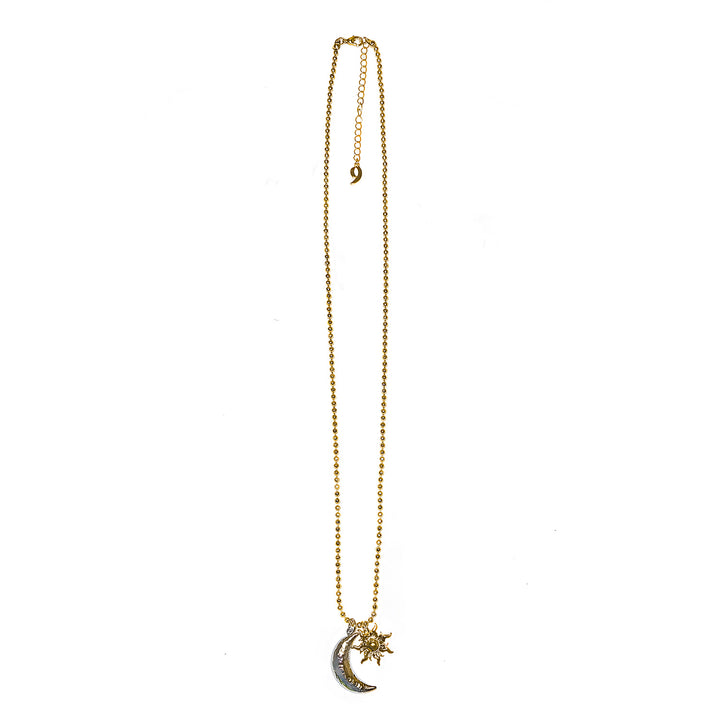 This necklace is made from gold- and silver-plated alloy and features a textured moon and a gold-plated sun charm. It measures 28 inches.