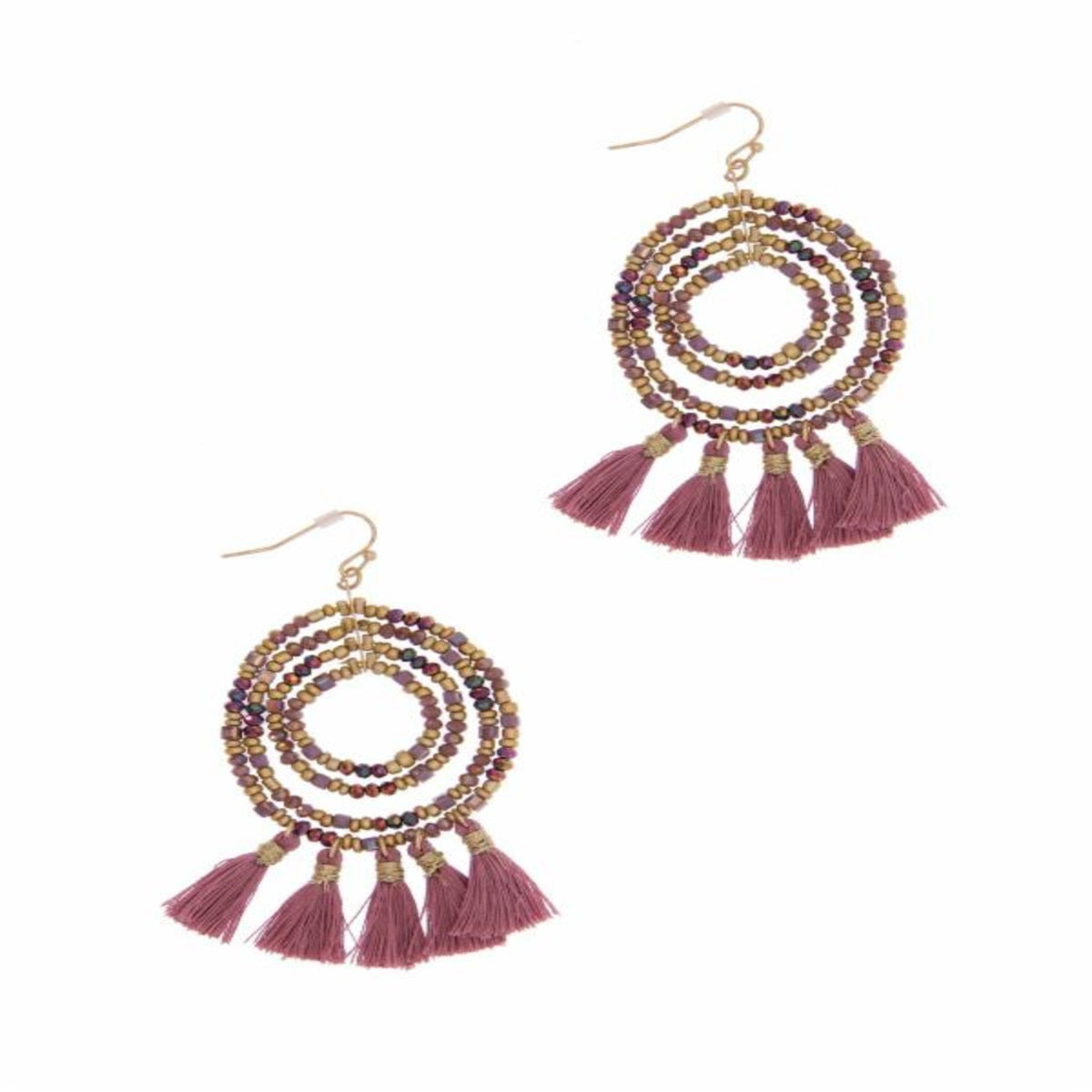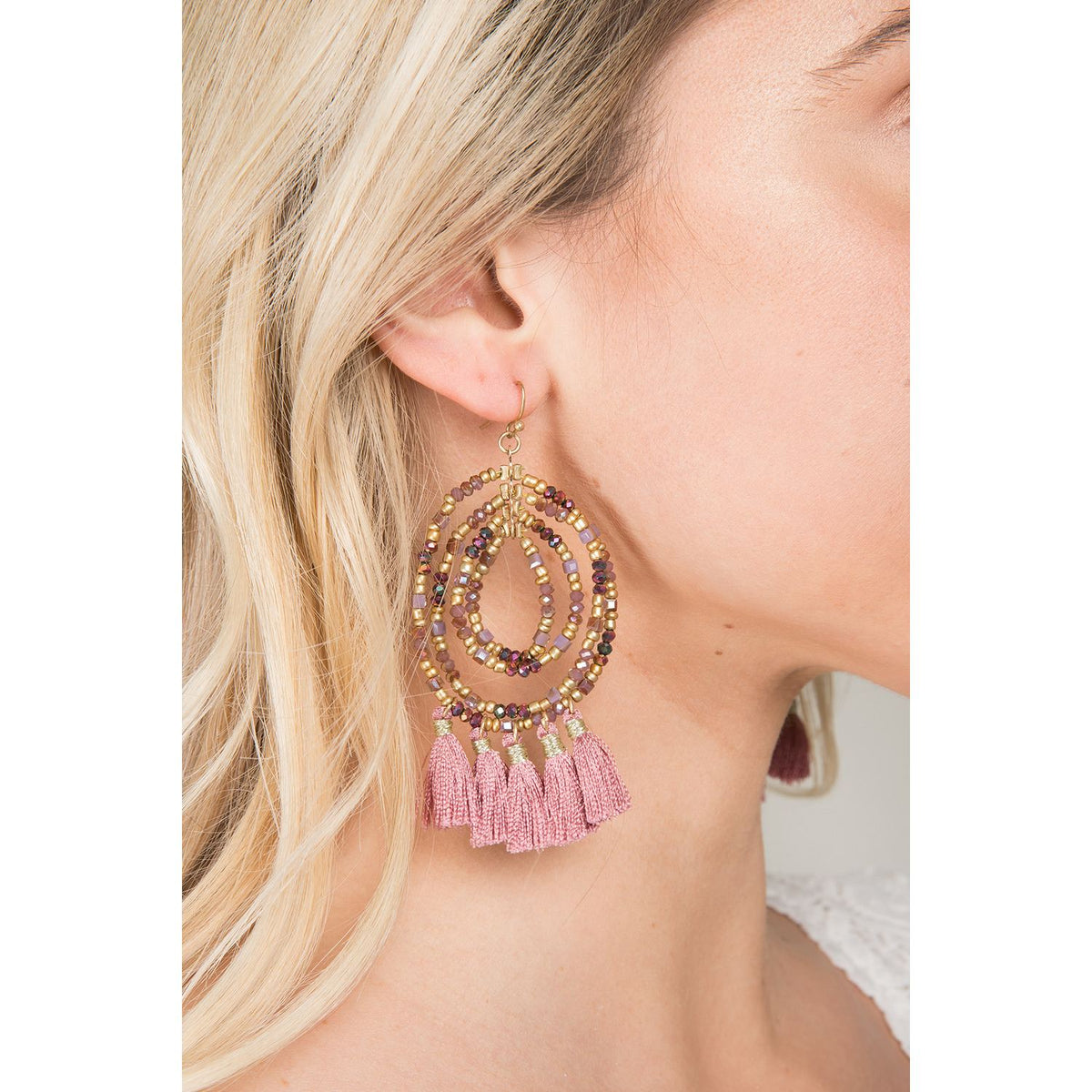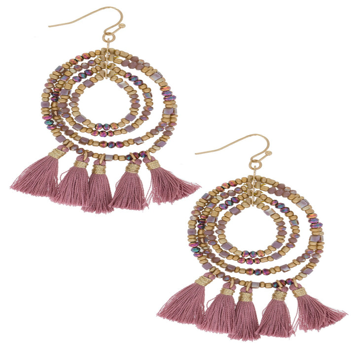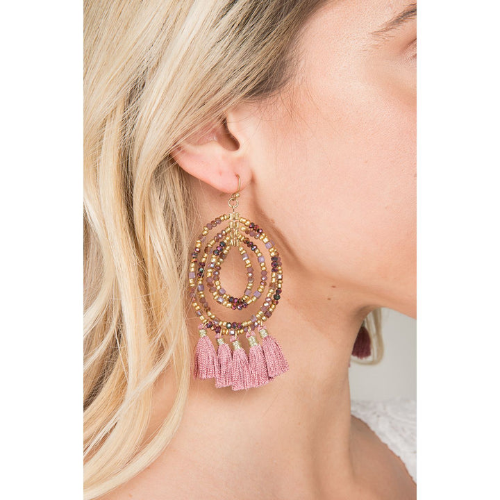 Beaded Tassel Hoop Pink Earrings