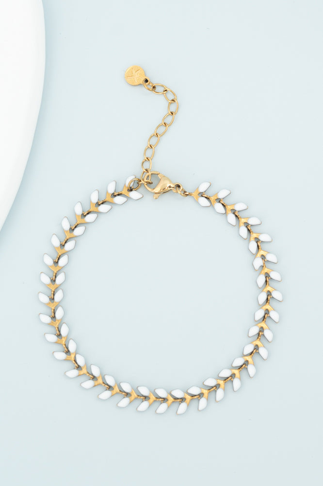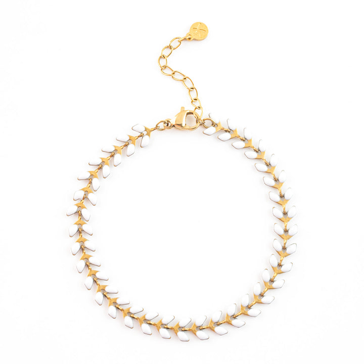 This bracelet is crafted from 14K gold-plated brass with an enamel finish. The design features delicate ivory-colored seeds. It is adjustable, hypoallergenic, and lead and cadmium-free.