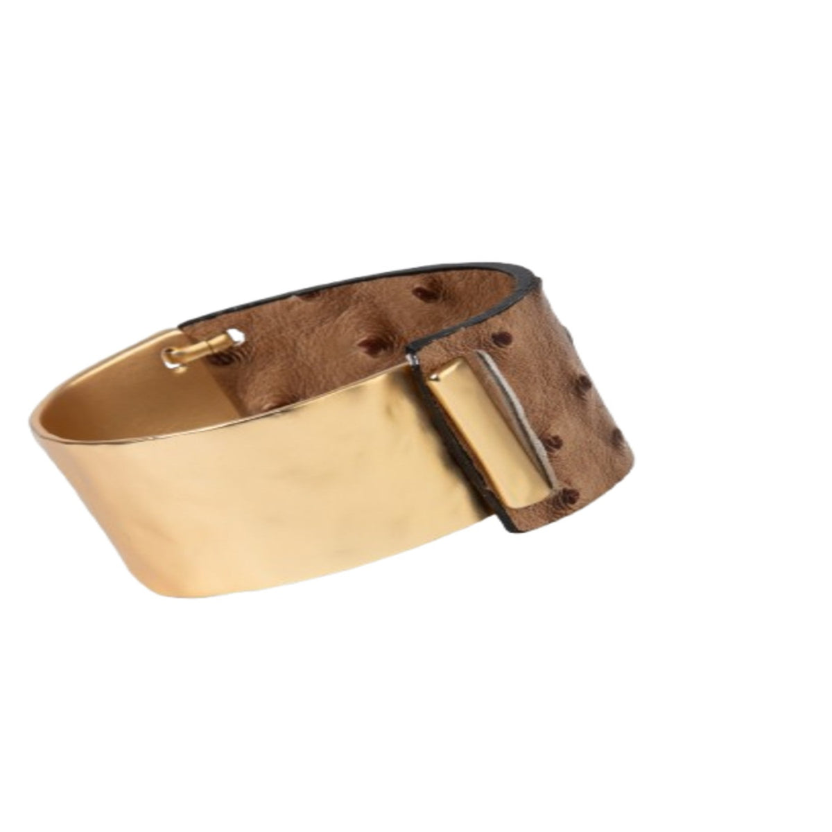 This Leather Metal Duo Gold Bracelet by Saachi is a bold and modern statement piece that effortlessly transitions from day to night. It features a thick, dotted leather band complemented by a sculptural metal accent piece, creating a look reminiscent of modern art. The interlocking closure makes it easy to wear, while the contrasting textures and luxurious finishes give it a sophisticated and edgy vibe. This bracelet is perfect for adding a touch of artistic flair to any ensemble.