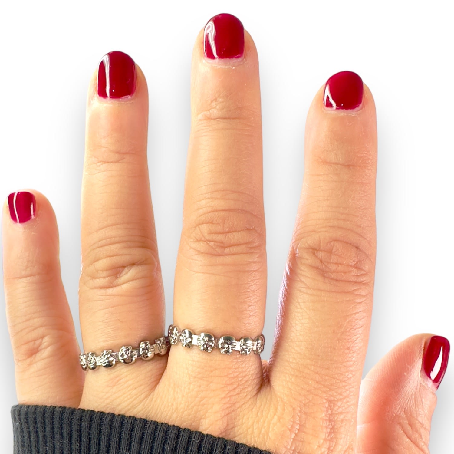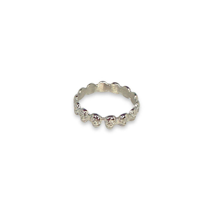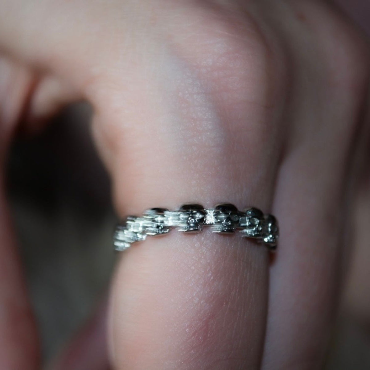 The Eternity Skull Ring by Jagged Halo Jewelry is a bold accessory that combines symbols of mortality, afterlife, and a new beginning. It brings a spirit of adventure and individualism to your style, serving as an emblem of rebellion, strength, and courageousness. This ring is the perfect way to express yourself and can be stacked with other rings for an edgy look.
