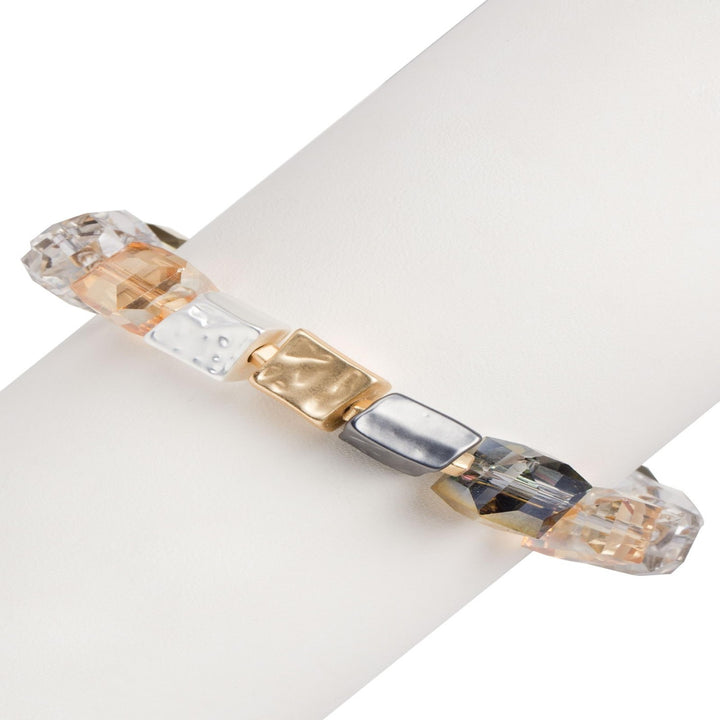 This Faceted Bead & Stone Gold Bracelet by Saachi is a modern and classic piece that will be a staple in your jewelry box for years to come. Its light-catching faceted glass beads shine and move with every step. The magnetic closure adds a bonus of being effortless to fasten, making this gorgeous bracelet easy to put on and take off while adding a touch of simple elegance to your look.