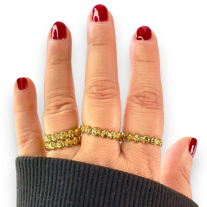 This ring is crafted from gold-plated material. It features an eternity style skull design.