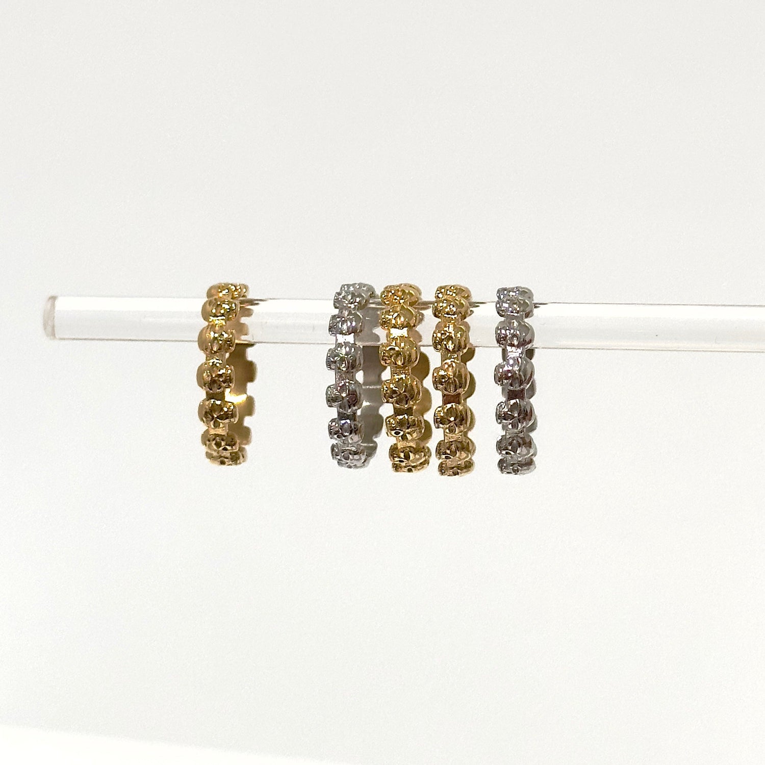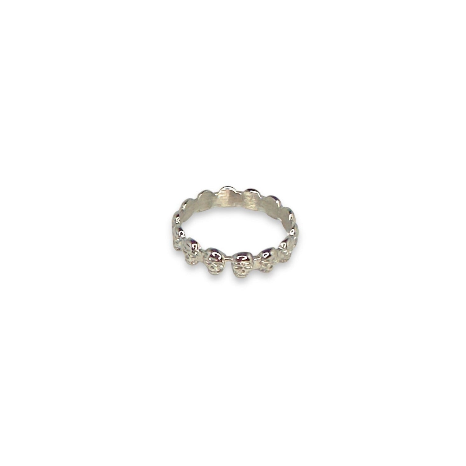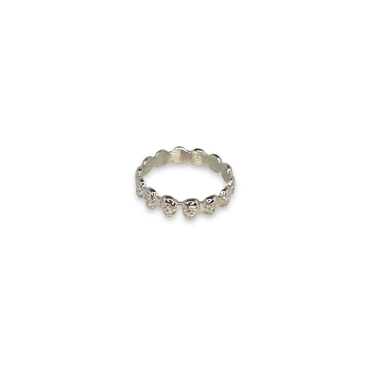 This Eternity Skull Ring by Jagged Halo Jewelry is a bold and rebellious statement piece. The eternity style skull design brings together symbols of immortality, fate, and new beginnings, perfect for expressing a spirit of adventure and individualism. This ring is an emblem of strength and courage, and its edgy design makes it ideal for a mixed-size stack.