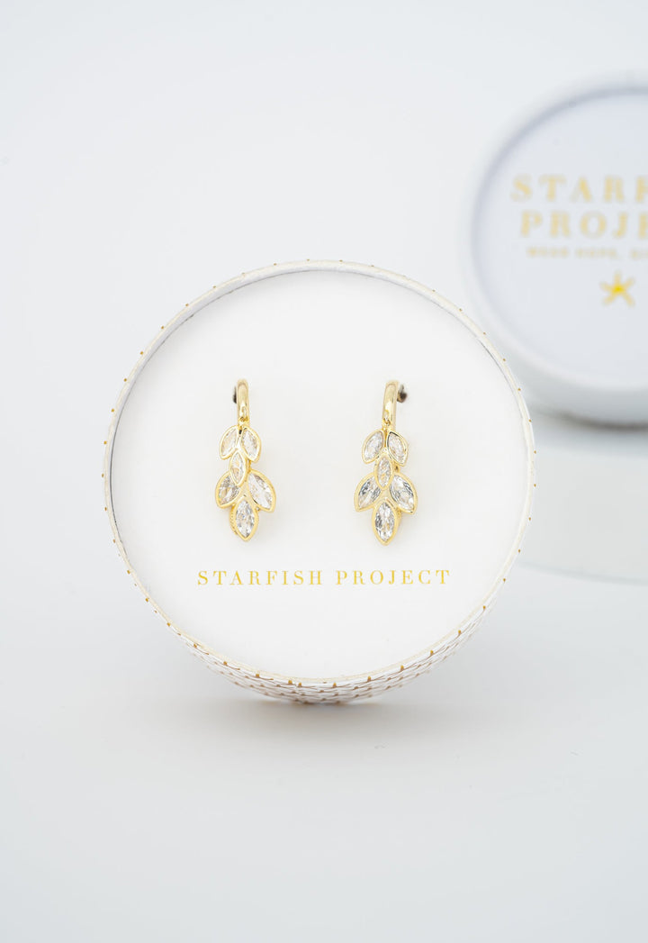 The Golden Laurel Drops by Starfish Project are a stunning tribute to strength and beauty. Crafted in 14K plated gold, each delicate hoop is adorned with shimmering marquise-cut crystals that resemble laurel leaves, symbolizing victory and new beginnings. Their graceful and radiant design makes them a wear-anywhere treasure, perfect for both formal occasions and everyday elegance. By purchasing these earrings, you join in restoring hope to survivors of exploitation.