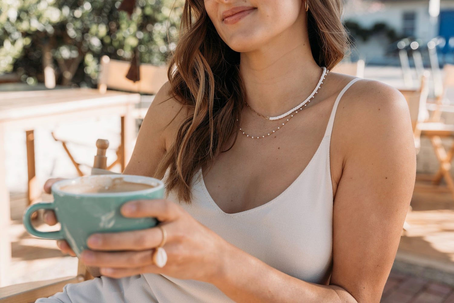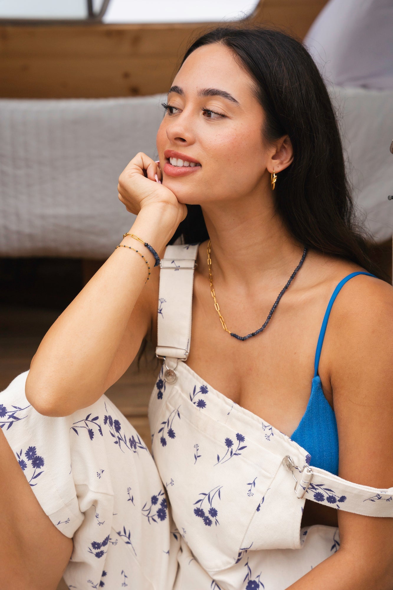 This Paloma Necklace by Salty Cali is a unique and sophisticated accessory that is the best of both worlds. The necklace features a half paperclip chain and half colorful beads, creating a unique alternative to your staple pieces. Water-friendly and resistant to tarnishing, this necklace requires minimal upkeep and is perfect for layering or wearing on its own. The Paloma necklace adds a touch of playful sophistication to any look.