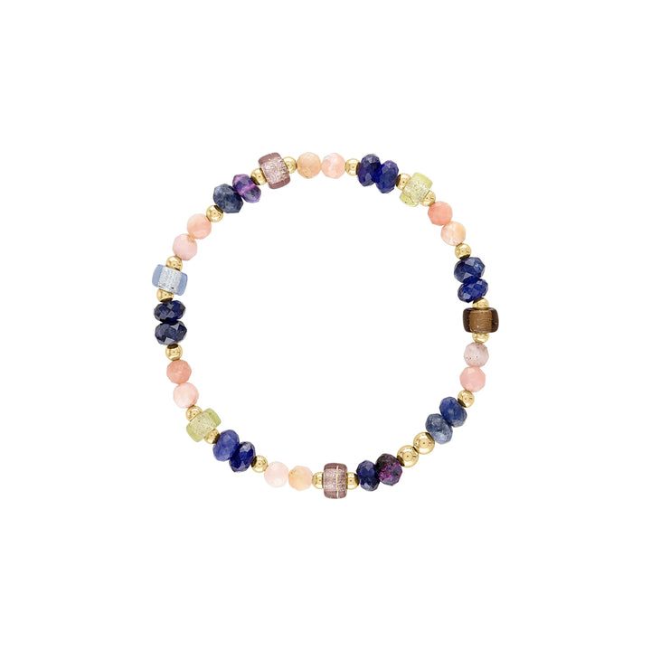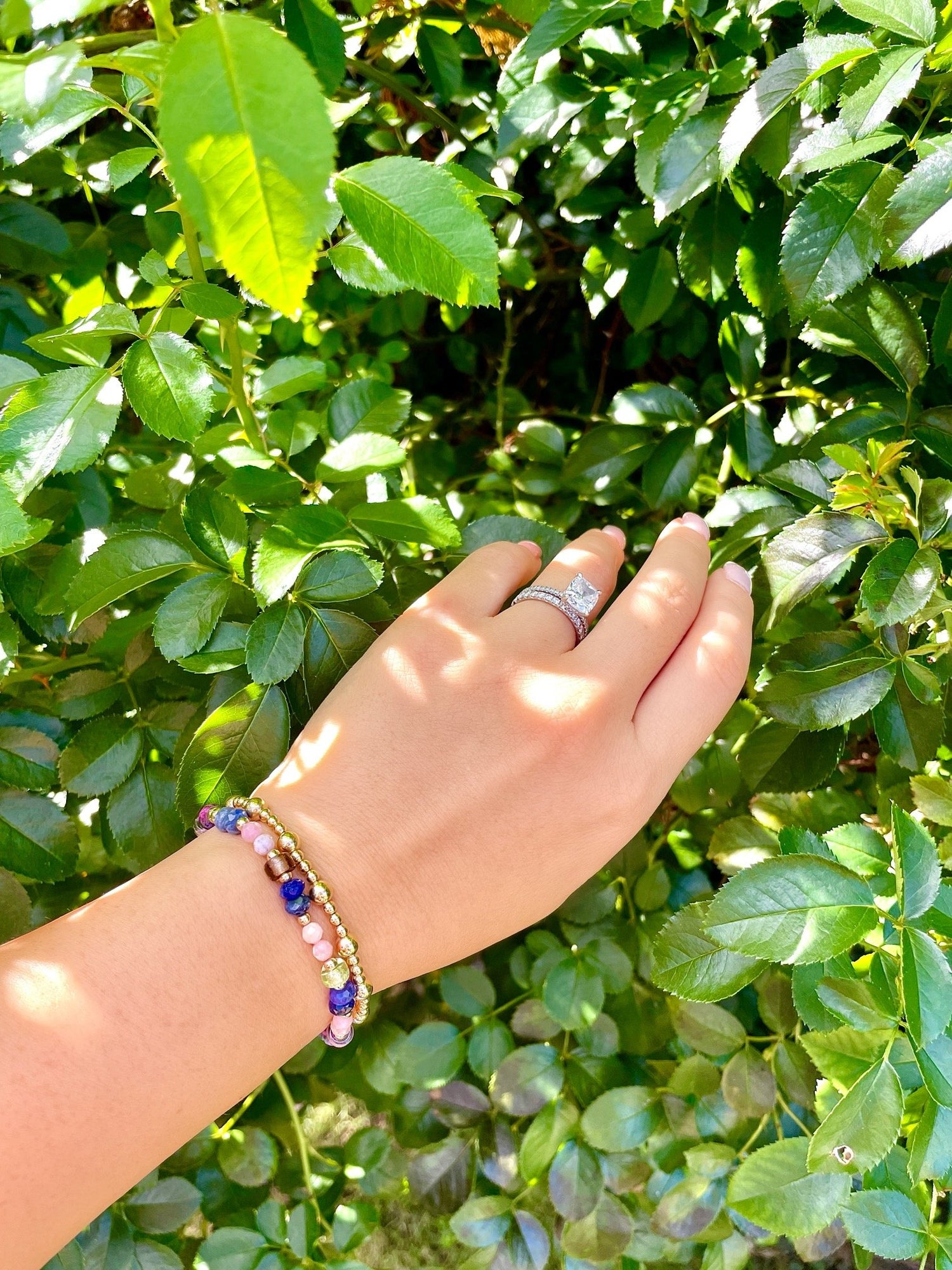 This stretch bracelet is handmade with 14k gold-filled beads (3mm and 4mm), sugalite purple gemstone beads, 6mm glass Czech beads, and pink opal gemstone beads. It is available in a 6.5-inch stretch.
