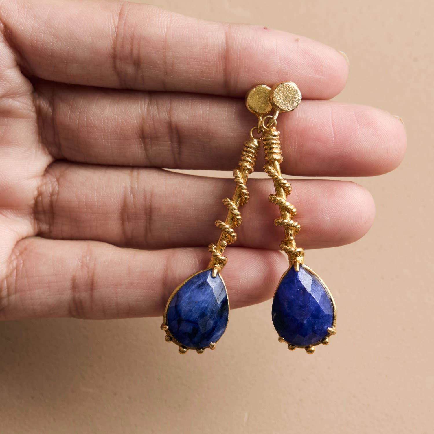 These earrings are crafted from brass metal with a 21-karat gold plating and a lacquer coating. They feature Lapis Lazuli teardrops.