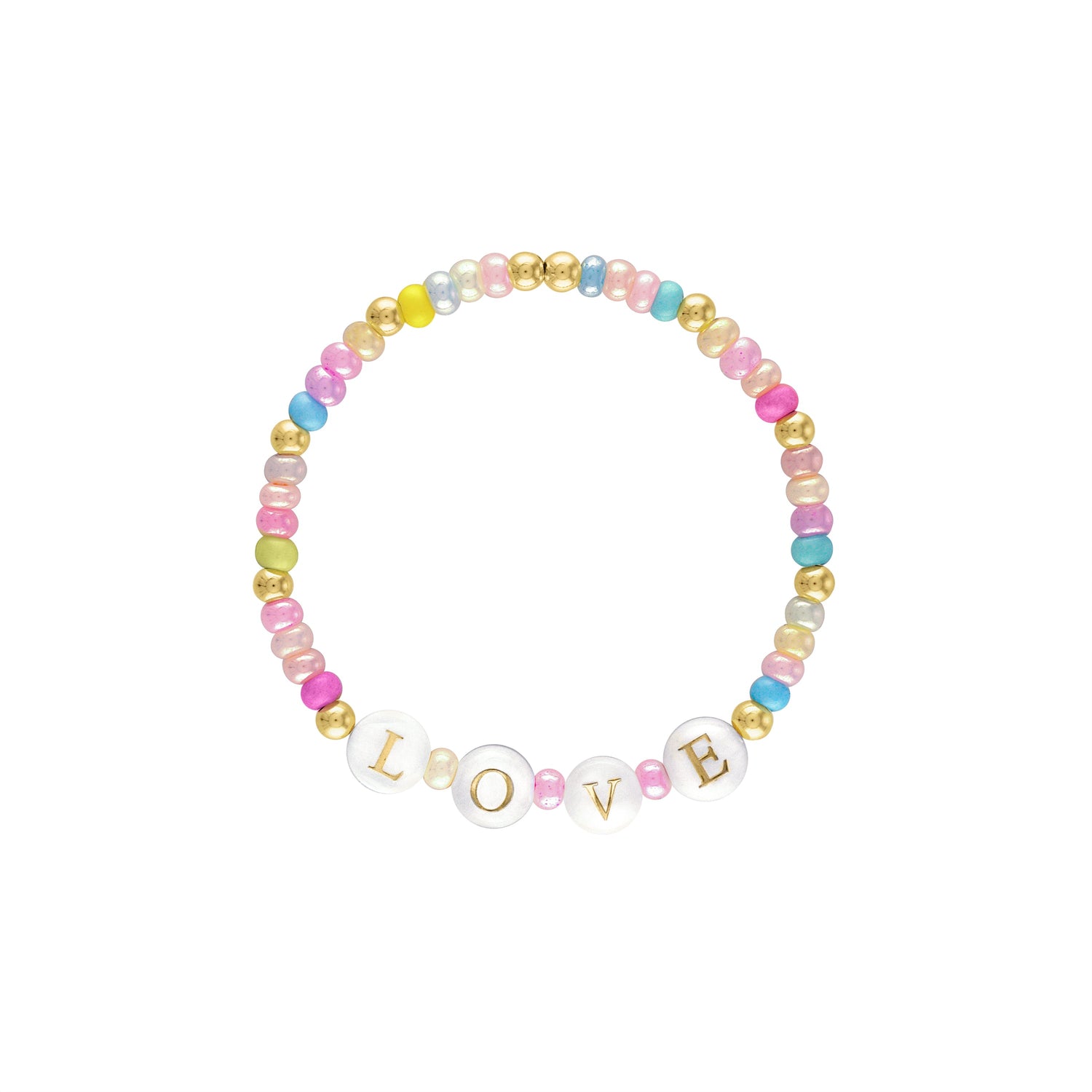 Handmade with 14K gold-filled 4mm beads, iridescent pastel Czech beads, and mother-of-pearl letter beads; stretch design; sizes available: 5.5", 6", 6.5", 7".