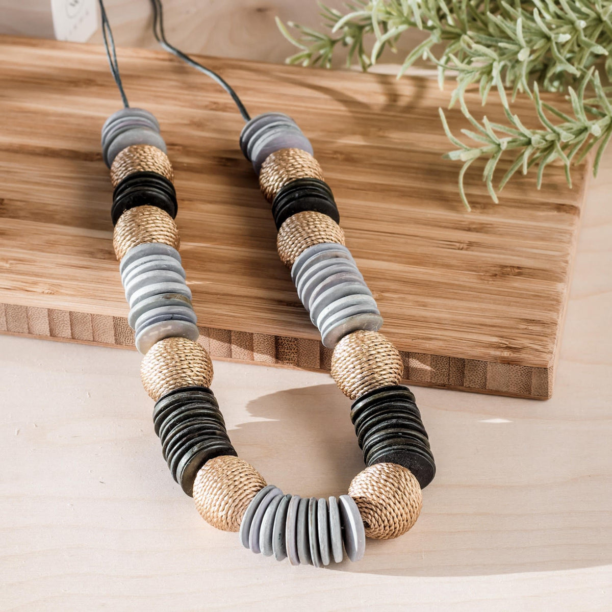This necklace is handcrafted from wood by artisans in the Philippines.