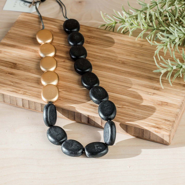 This necklace is a handcrafted adjustable wooden necklace in charcoal and gold tones.