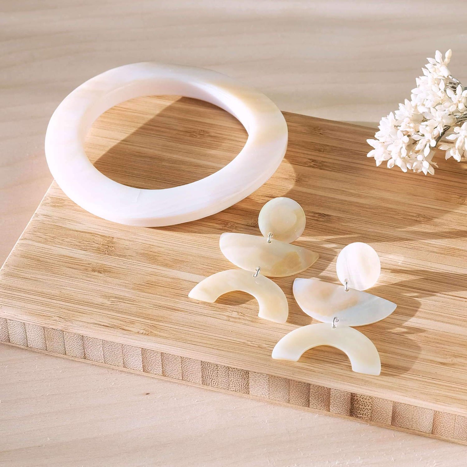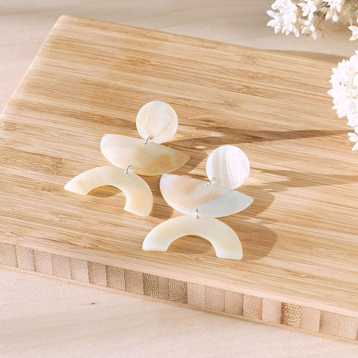 These handmade earrings are hand-carved, cut, and polished from mother of pearl.