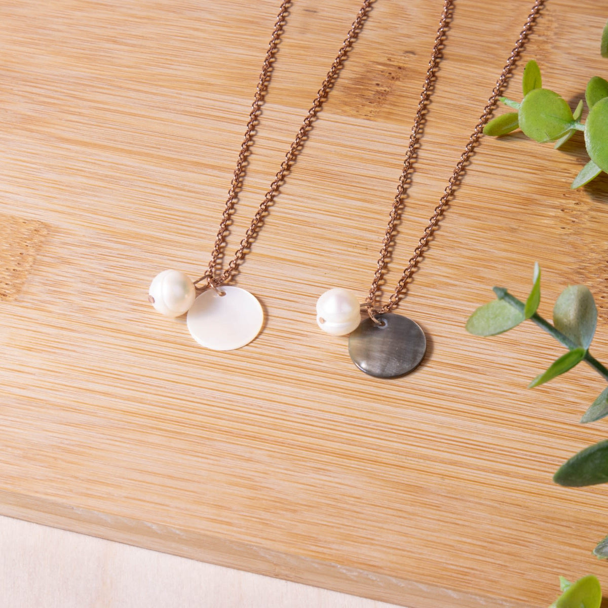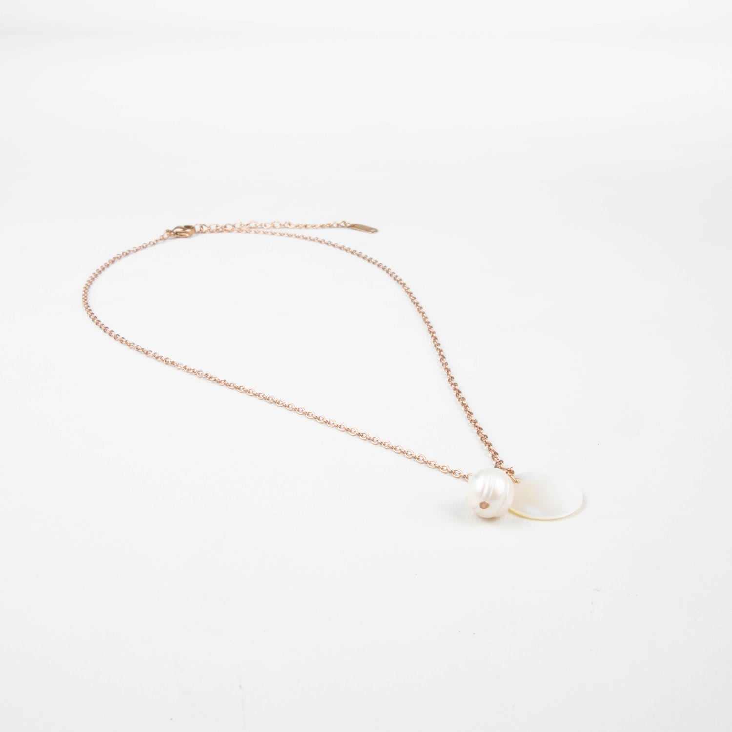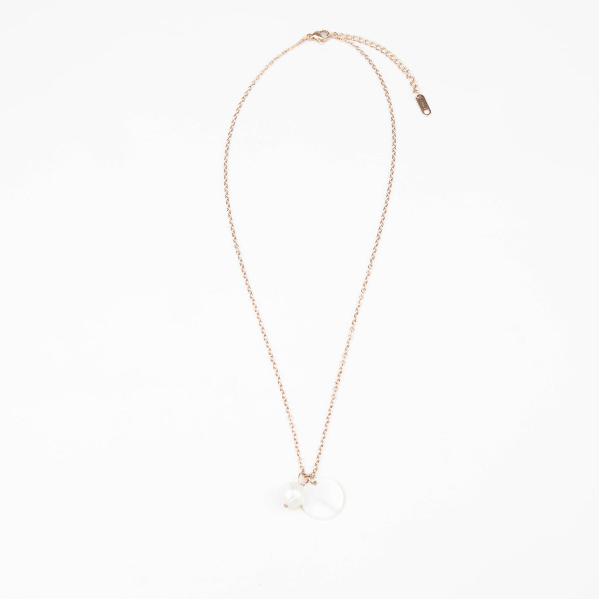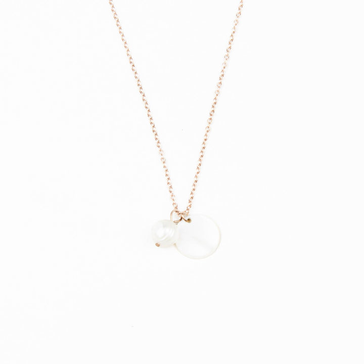 This necklace features a white mother-of-pearl disc and a freshwater pearl suspended from an 18k rose gold-plated chain.
