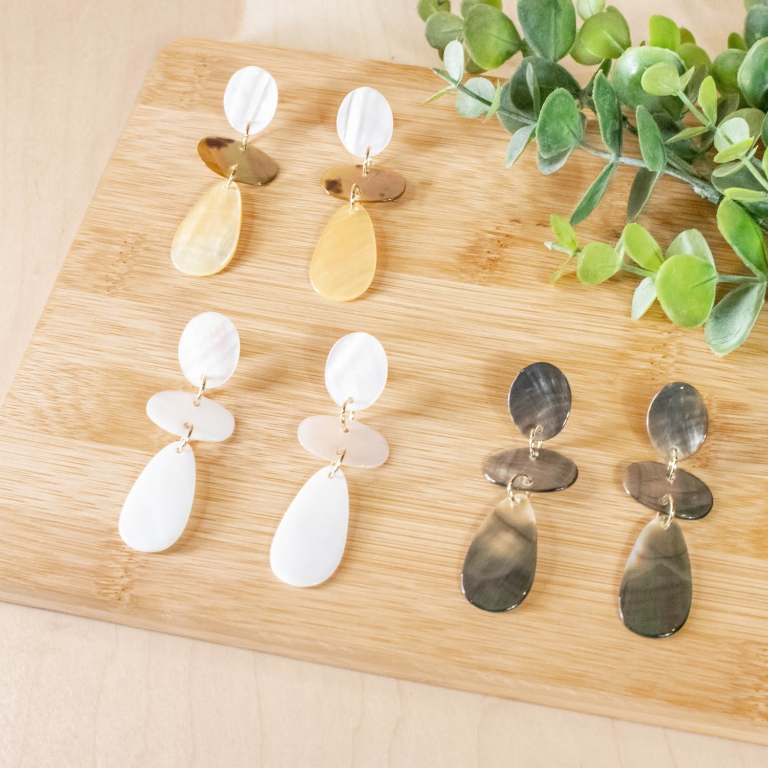 These dangle earrings are sustainably handcrafted from mother-of-pearl. Due to the material, slight variations in color and texture may occur.