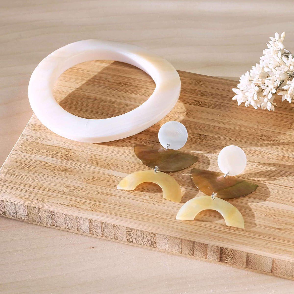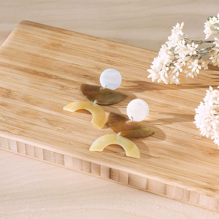 These Light Tricolor Long Geometric Earrings by Likhâ are a stunning and modern accessory. They are hand-carved, cut, and polished by master artisans from mother-of-pearl, and the long geometric design adds a beautiful accent to any outfit. They are a perfect blend of natural beauty and modern style, inviting you to embrace their uniqueness and imperfections.
