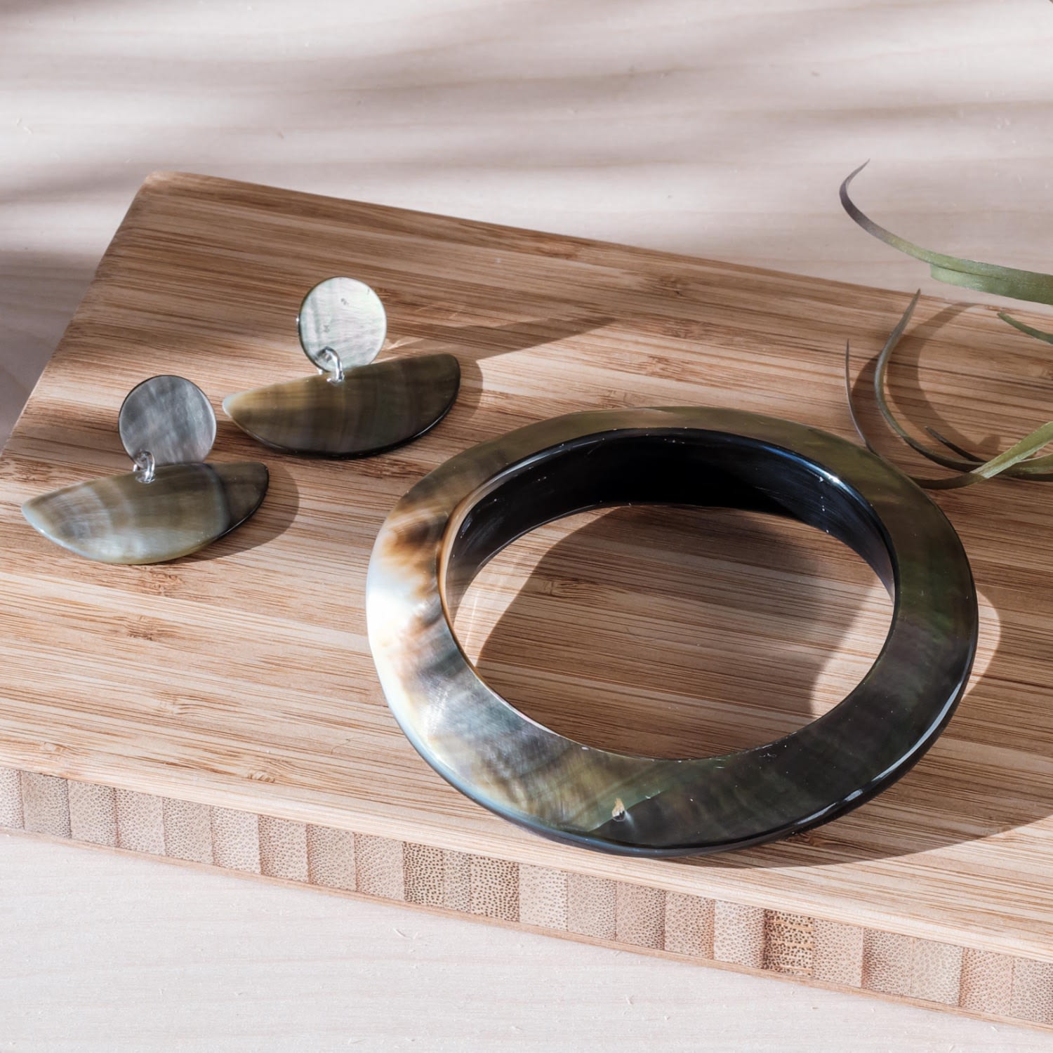 This bangle is seamlessly hand-carved from a single piece of mother-of-pearl shell. It has an iridescent grey color.