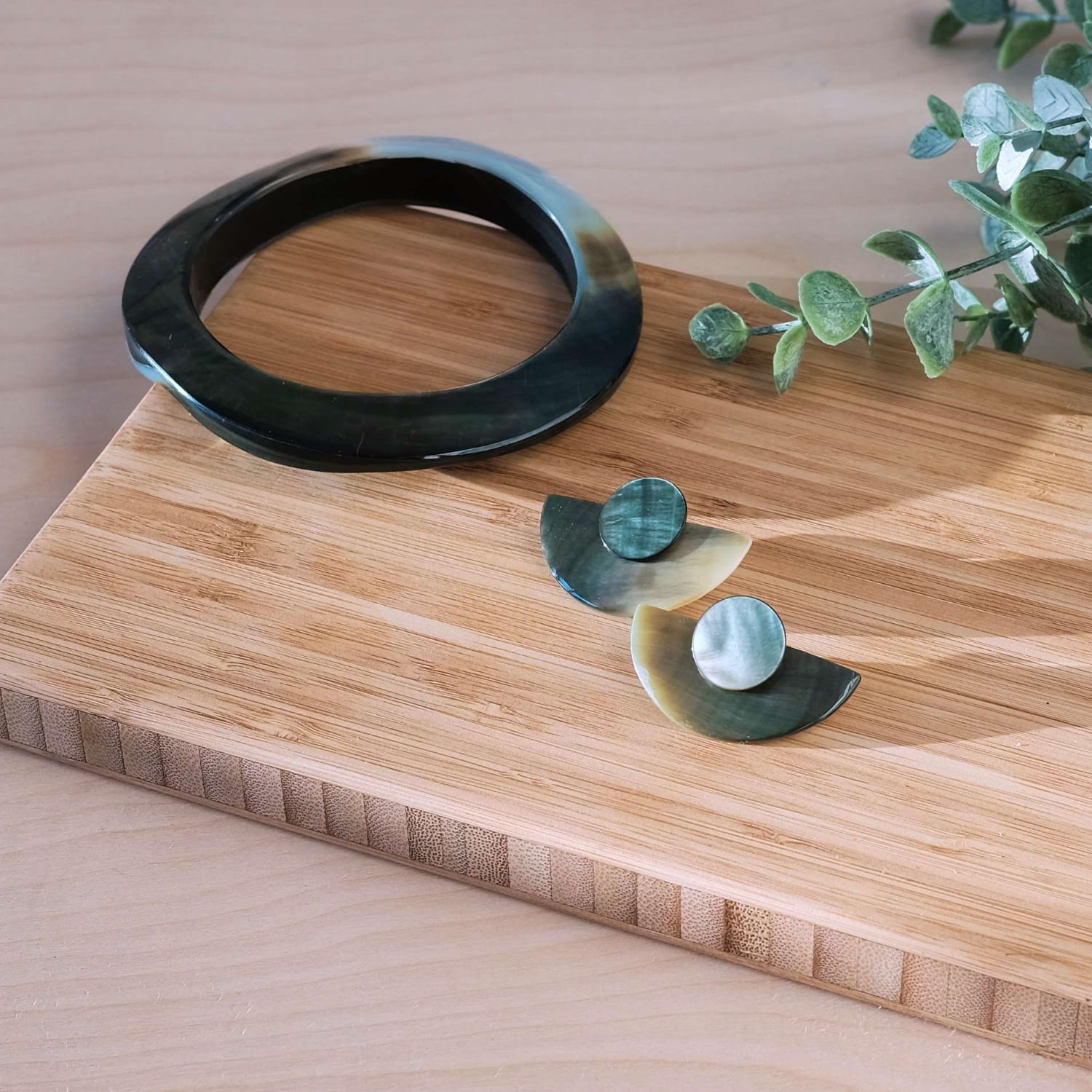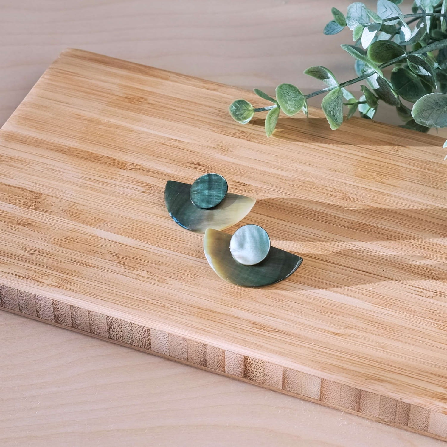 These earrings are hand-carved, cut, and polished from locally-sourced, dark grey mother-of-pearl.