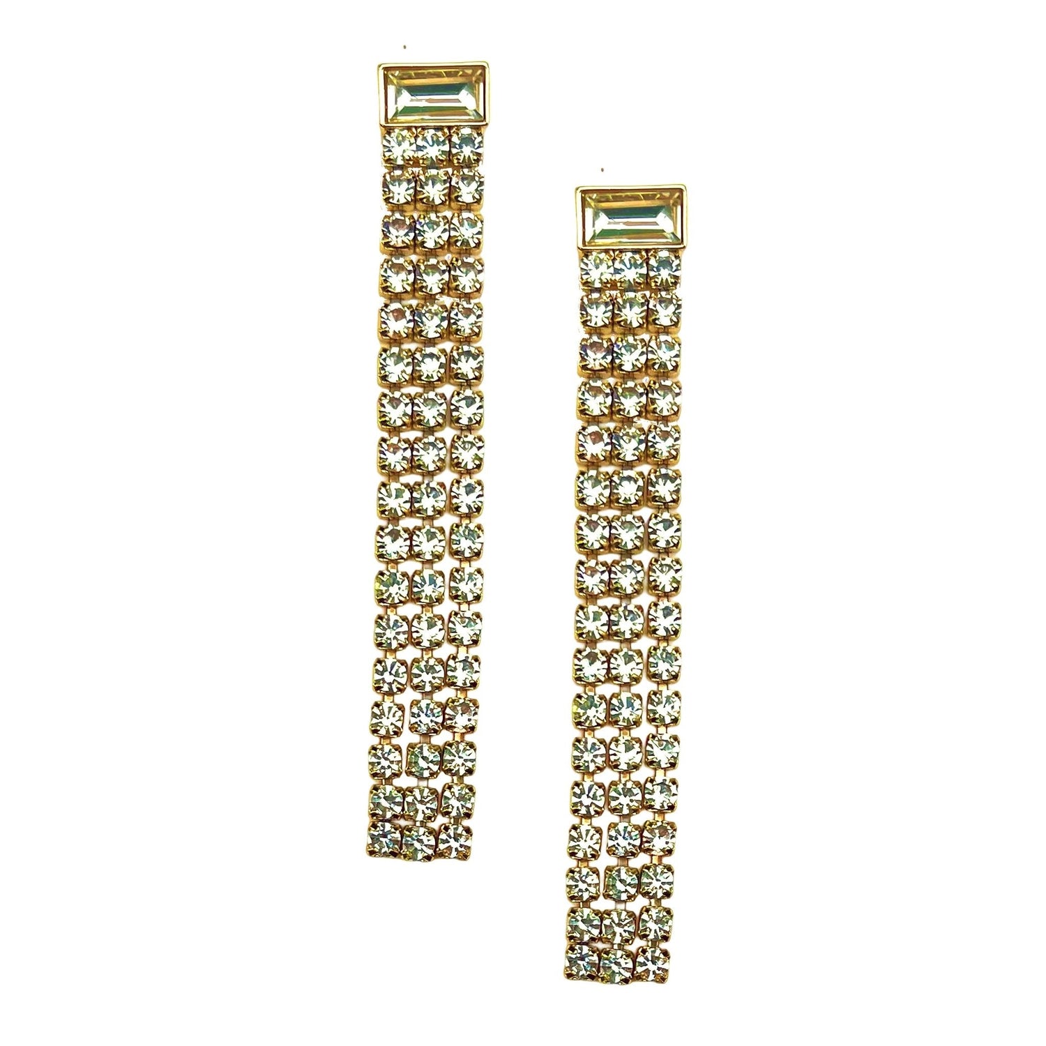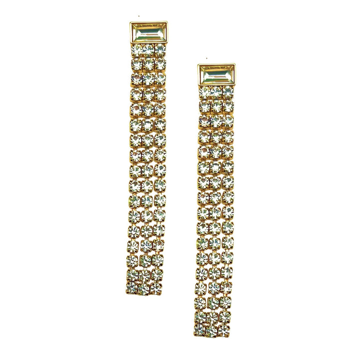 Statement Earrings With Baguette Rhinestone Top & Chain Fringe - Gold Plated