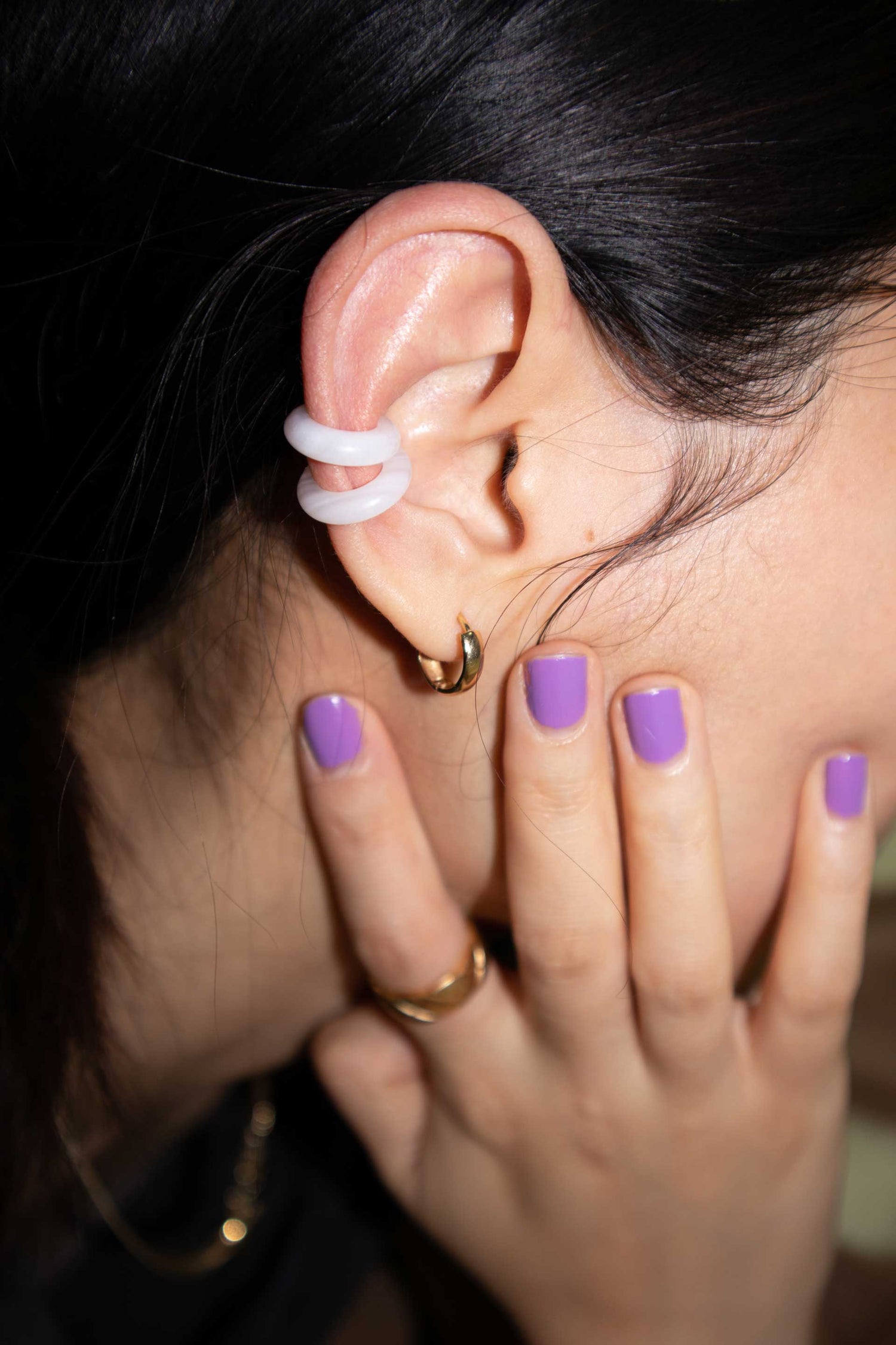This Abby Single Jade Cuff Earring by Seree is a delicate and versatile accessory that adds a subtle touch of elegance to any ear. Sold individually, this cuff is a minimalist statement piece perfect for wearing anywhere along your ear to add a unique detail. The natural, untreated seashell jade has a smooth texture and a beautiful white color that makes it a sophisticated accent. This cuff is a quiet and modern way to embrace the timeless beauty of jade.